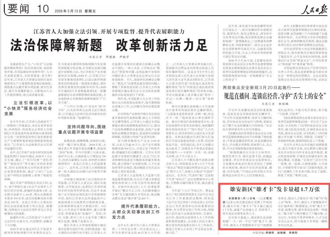 人民日报3月13日关注河北雄安新区:雄安新区“雄才卡”发卡量超1.7万张。