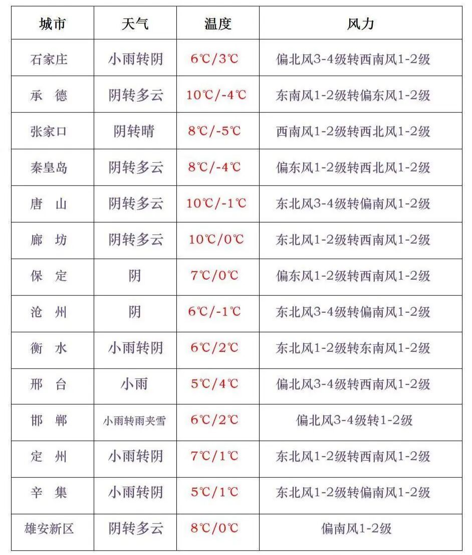 【雨雪降温持续】今天(3月14日)白天,我省以阴雨天气为主,保定、石家庄、邢台、邯郸四个地区的西部山区阴有小雪或雨夹雪,局地有中雪。14-15日早晨,全省大部分地区最低气温下降3~6℃,其中坝上地区下降6~8℃。石家庄小雨转阴,3~6°C;雄安新区阴转多云,0~8°C;北京多云转晴,0~10°C。