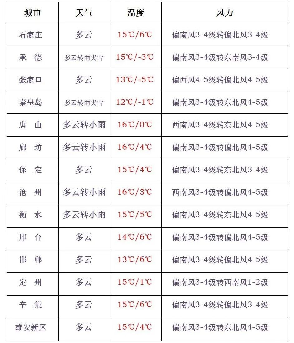 【局地有降水】今天(3月17日)白天,全省多云间阴,其中张家口北部、承德北部有零星小雪或雨夹雪,邢台西部、邯郸南部有小雨或零星小雨。石家庄今天多云,6°C~15°C;雄安新区多云,4°C~15°C;北京多云,4°C~12°C。