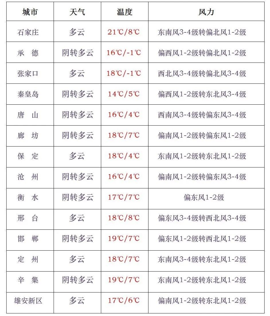 【局地有风】今天早晨,平原中南部地区最低气温下降3~6℃。今天白天,全省阴转多云,张家口、承德、保定西北部有西北风4到6级,阵风7到8级。今天夜间到明天白天,渤海海域和沿海地区有东北风5到6级,阵风7到8级。