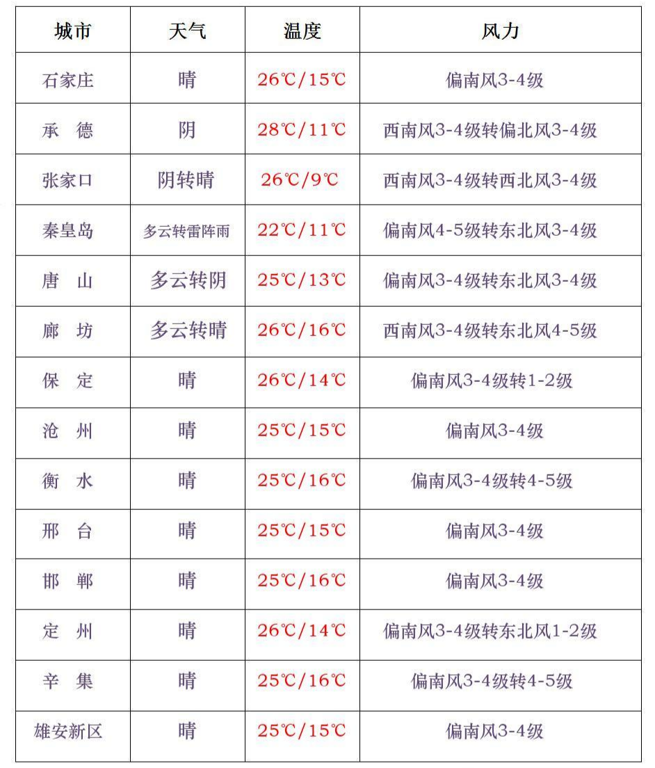 【雷阵雨+大风】今天(4月25日)白天,承德中北部和保定、石家庄、邢台、邯郸四个地区的西部多云转阴有分散性雷阵雨。这个周末我省多大风和分散性雷雨天气,雷雨时局地伴有短时大风等强对流天气,个别地点有冰雹。石家庄晴,15~26°C;雄安新区晴,15~26°C;北京多云,14~26°C。