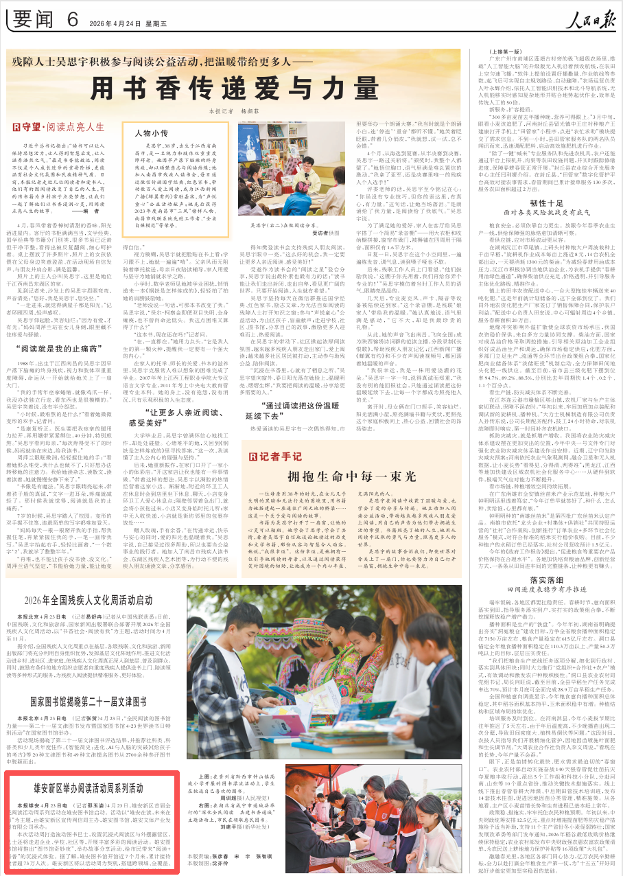 人民日报4月24日关注河北雄安新区:雄安新区举办阅读活动周系列活动。