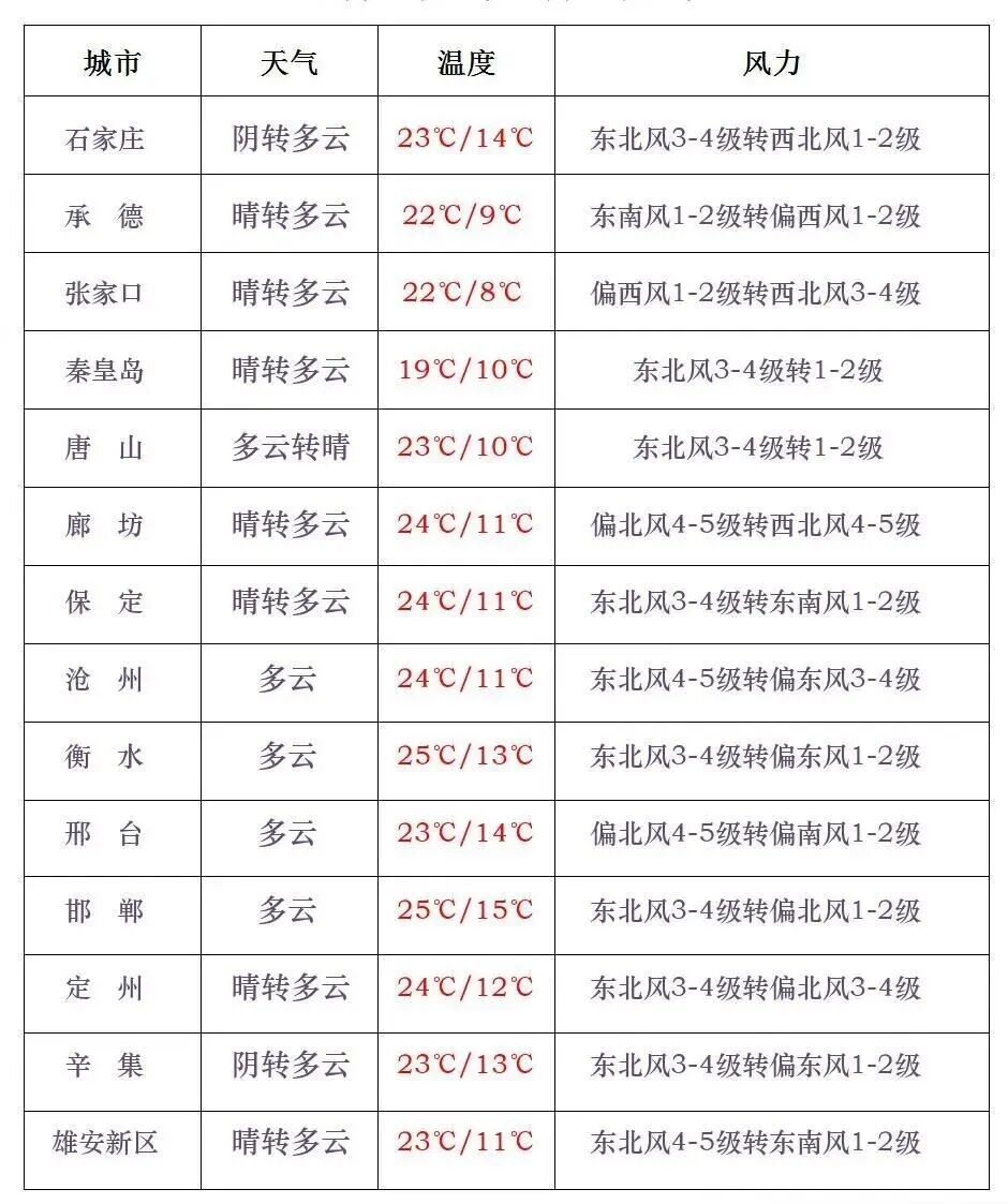 【雷雨、大风、降温齐登场】今天(4月26日)白天,石家庄、沧州以南地区多云间阴有分散性雷阵雨或阵雨,张家口北部、承德北部晴转多云,冷空气活动频繁,大部地区有大风天气。今天、明天早晨,北部和东部地区最低气温下降。石家庄阴转多云,14~23°C;雄安新区晴转多云,11~23°C;北京多云,14~26°C。