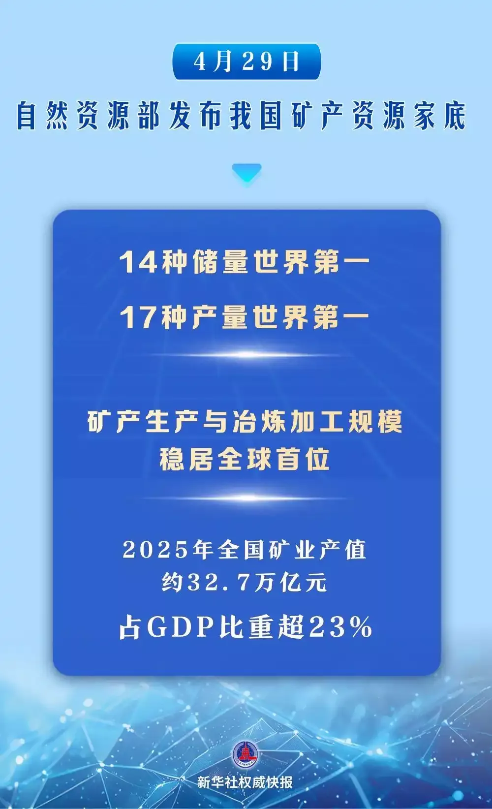【我国矿产资源家底公布】我国新一轮找矿突破战略行动取得一系列新突破,我国稀土、钨、锡等14种矿产储量居世界第一。2025年,我国煤炭、钒、钛等17种矿产产量居世界第一。