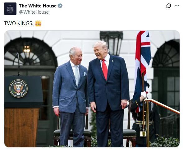 美国白宫28日在社交媒体发布一张特朗普欢迎查尔斯三世到访的照片,配文“两个国王”,后面还缀了一顶王冠。美国网友纷纷吐槽:美国马上要建国250周年了,咋还来了一个新国王?让那些美国“国父”们情何以堪?