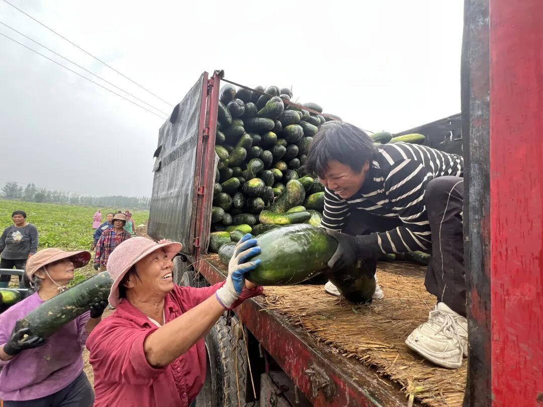 为筑牢产业根基,今年春季公司从山东寿光请来专业技术团队,全程进行指导。基地推行全流程标准化管理:从良种筛选到田间管护,从水肥一体化灌溉到科学种植,从病虫害防治到采收分级,每一个环节都严格把控,既保障了冬瓜的优良品质,又稳定了产量规模。这份精心培育,不仅结出了饱满的果实,更结出了民生暖意——基地优先吸纳本村及周边群众务工,让160余名村民在自家门口实现就业,用勤劳的双手捧起“稳稳的幸福”。