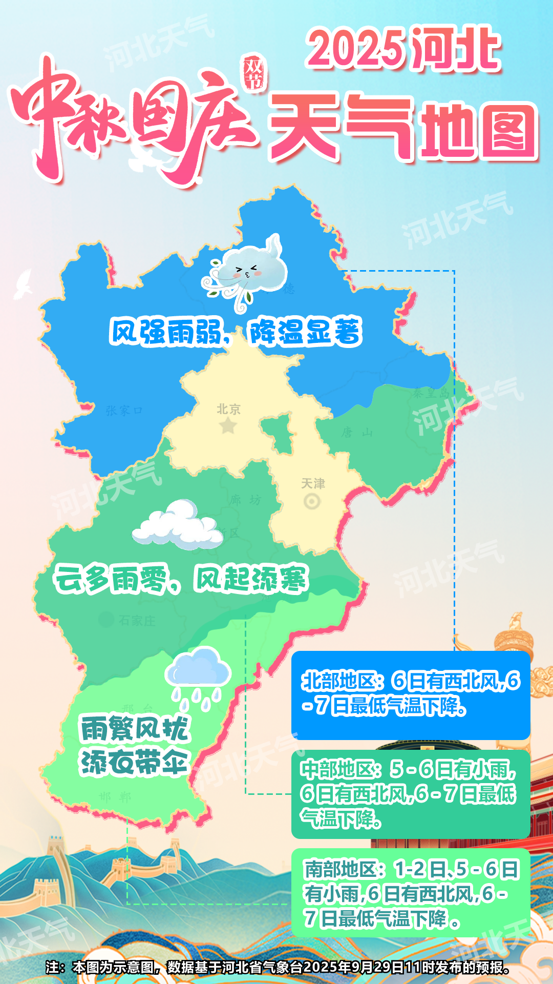 10月1日夜间到2日,石家庄、沧州以南地区阴有小雨或零星小雨转多云,个别地点有中雨,其他地区晴间多云。