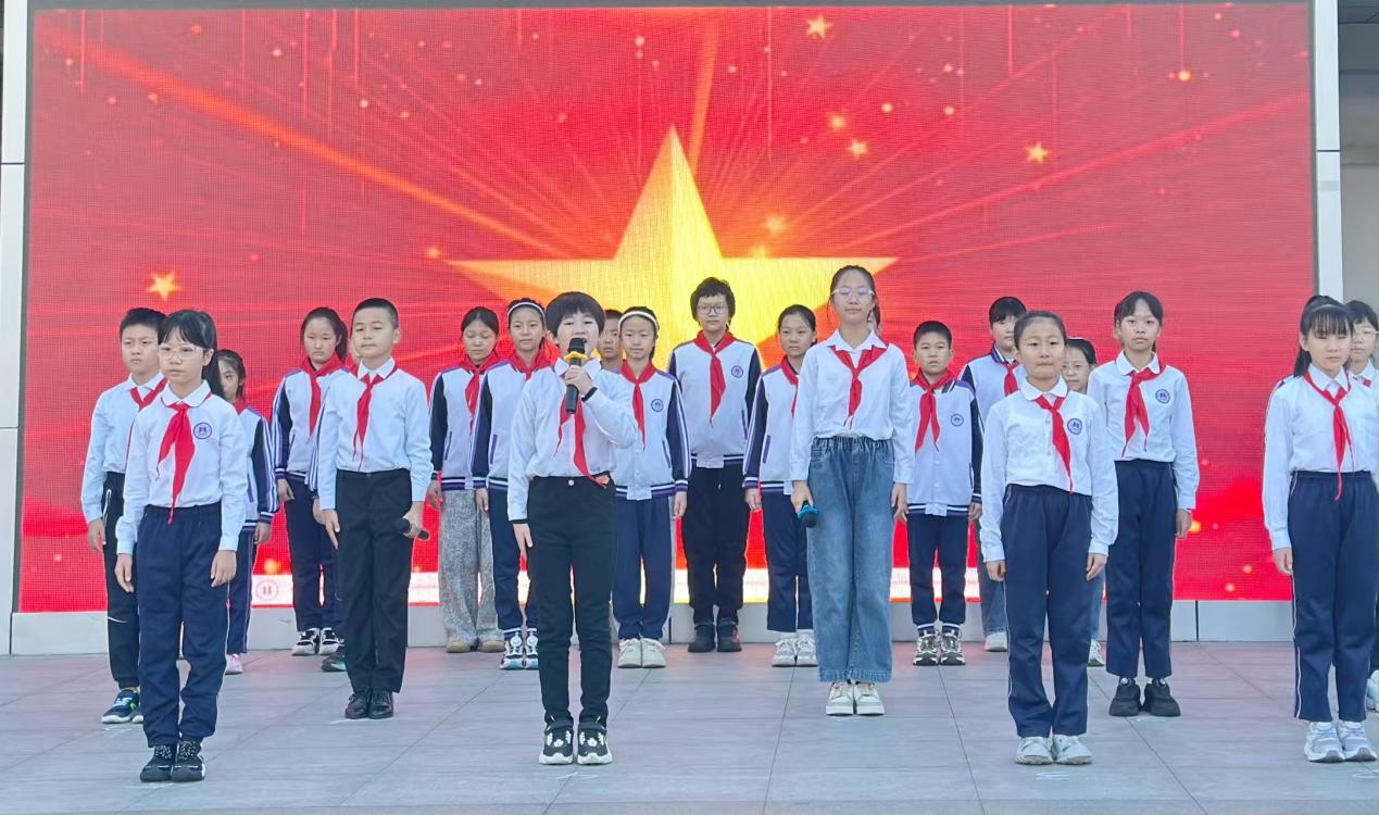 活动中,五二中队的队员代表率先走上台,用生动的语言向在场师生讲述建队日的来历—— 从少先队的历史渊源,到旗帜与徽章的象征意义,一个个鲜活的故事让新队员们对即将加入的组织有了更深刻的认识。随后,中队成员们带来了精心编排的朗诵表演,铿锵有力的词句、饱含情感的演绎,不仅展现了老队员的精神风貌,更传递出对少先队精神的传承与热爱,让现场的新队员们深受感染,对成为一名少先队员充满了期待。