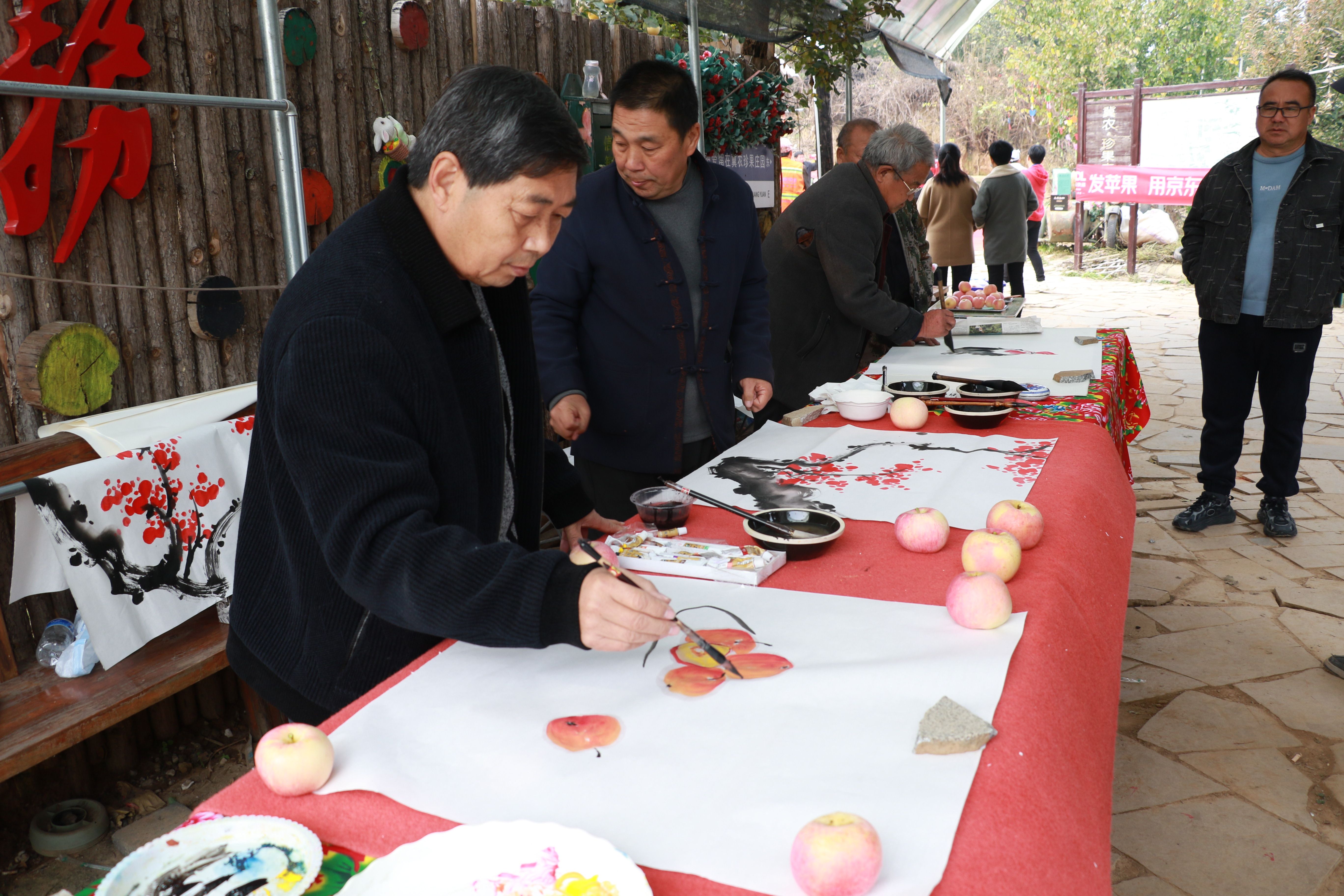 此外,当地的几位书法爱好者,在现场挥墨泼毫,以“乡村丰收”“苹果满枝”等主题进行现场创作,为采摘节助力。