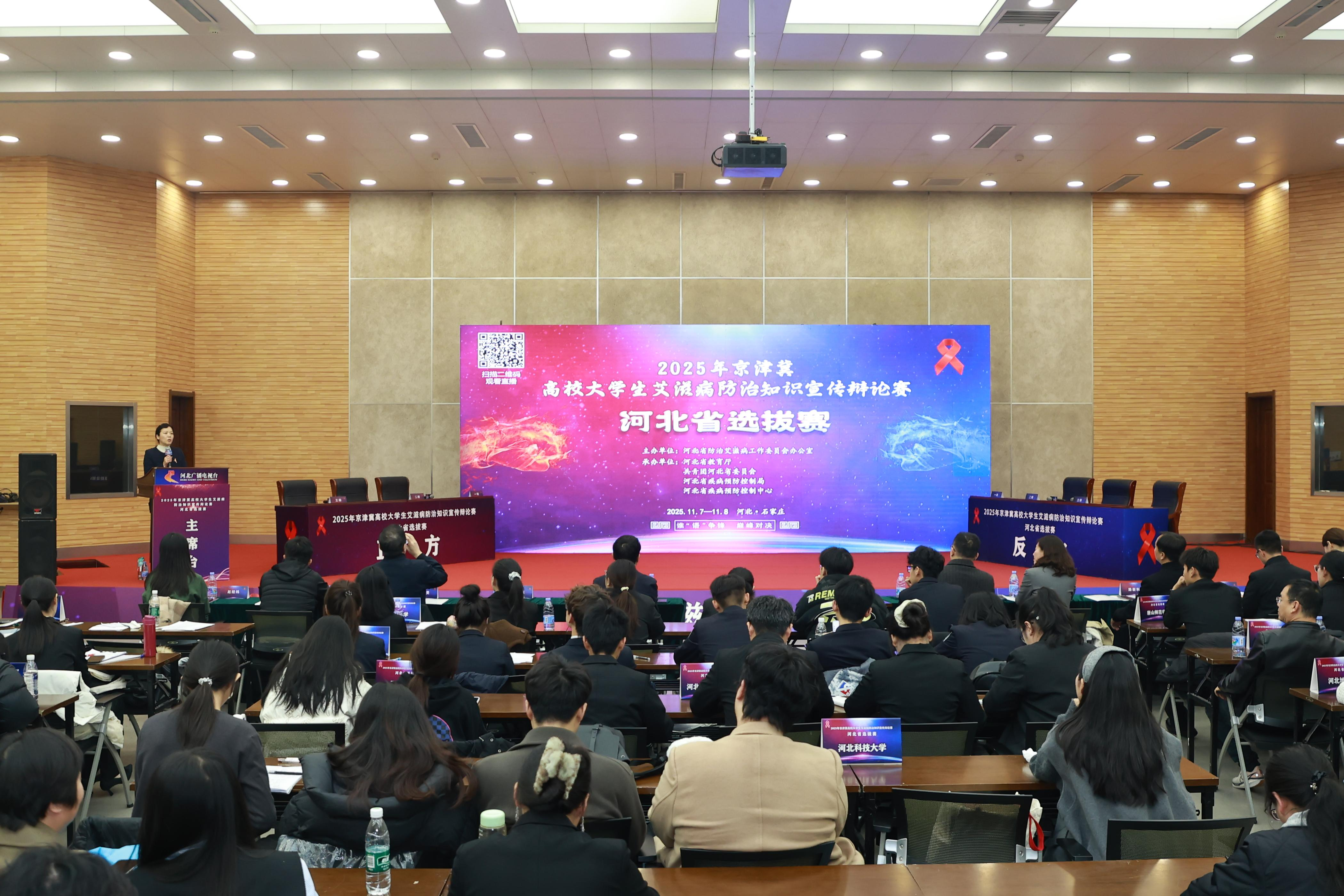 11月8日,2025年京津冀高校大学生艾滋病防治知识宣传辩论赛河北省选拔赛在河北广播电视台成功举办。本次大赛由河北省防治艾滋病工作委员会办公室主办,省疾病预防控制局、省教育厅、共青团河北省委、省疾病预防控制中心共同承办。来自全省11个地市的24支高校代表队齐聚一堂,围绕性教育、艾滋病防治、社会责任等热点议题展开激烈辩论,展现当代大学生的思辨风采与青春担当。