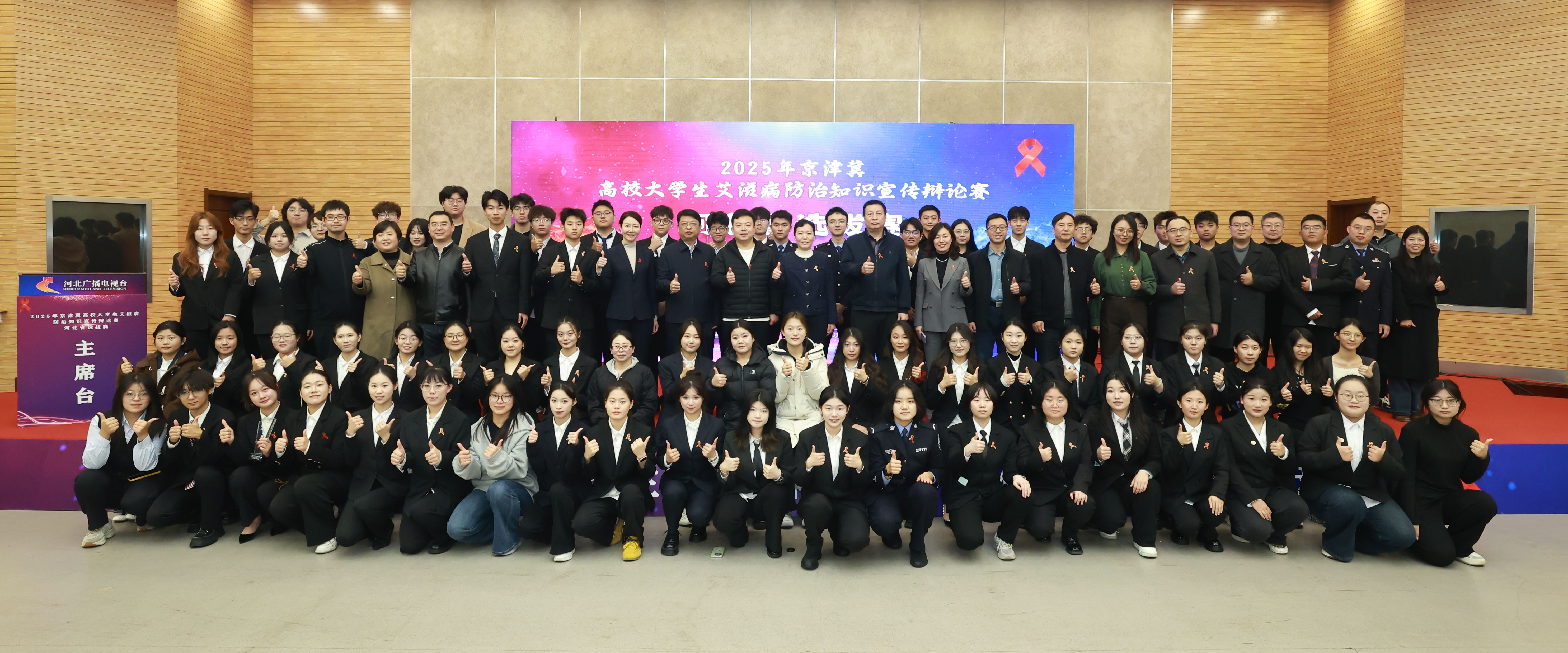 活动在全体参赛师生与领导嘉宾的合影中圆满落下帷幕。此次辩论赛不仅是一场智慧的较量,更是一堂生动的防艾公开课。相信参加比赛的辩手们今后一定能够将所学知识转化为行动,争做防艾宣传的先锋,为构建健康河北贡献青春力量。