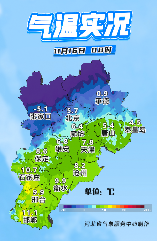 根据国家气象站观测数据统计,昨日8时,除张家口大部和承德中北部气温在冰点及以下外,我省其他地区气温多在2~11℃上下,该时刻全省气温最高值出现在邯郸武安,为13.9℃,最低值出现在张家口康保,为-14.1℃。和15日同时刻相比,张家口大部、承德西北部、石家庄中西部、邢台大部、邯郸、衡水东部、沧州大部、唐山南部气温下降了2~12℃不等,省内其他地区气温则上升了2~7℃左右。
