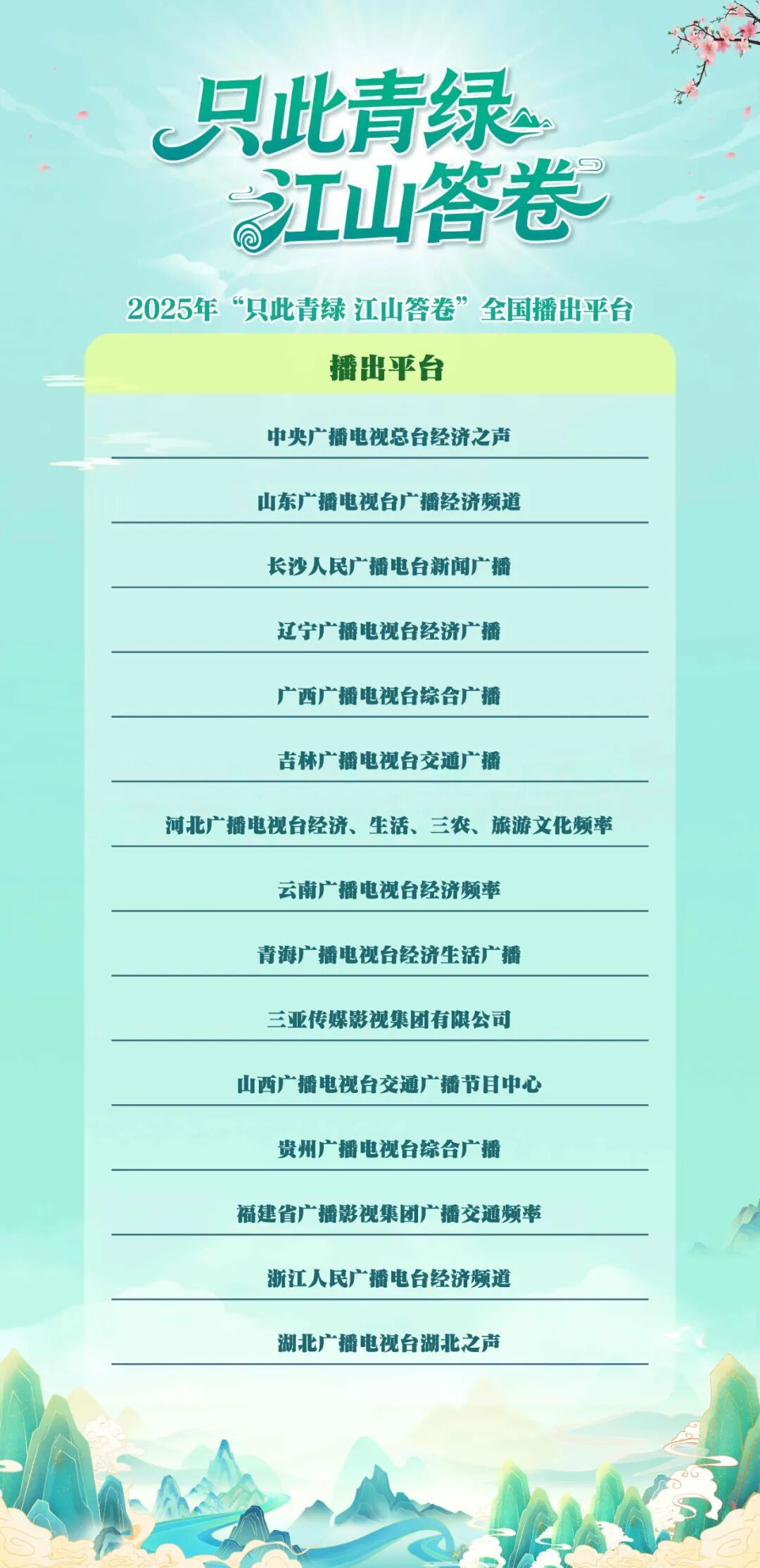 值此 “两山” 理念提出二十年之际,中央广播电视总台经济之声、山东广播电视台经济广播、河北广播电视台三农广播、长沙广播电视台新闻广播、辽宁广播电视台经济广播、广西广播电视台综合广播等全国 15 家广播电台联合人民日报全国党媒平台、农民日报、长城新媒体集团共同推出全媒体报道《只此青绿 江山答卷》,看一笔青绿,如何绘出崭新画卷!