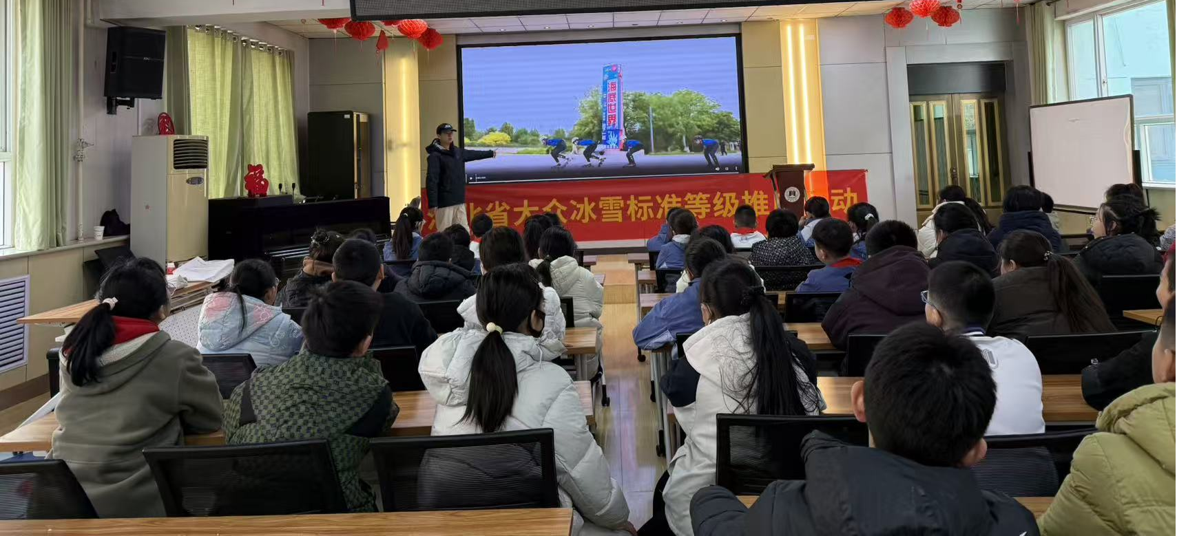 活动伊始,室内冰雪特色理论课堂率先开讲。专业教练刘佳迪借助生动的课件,从器材原理科普入手,通过对比冰刀与轮滑鞋的结构差异,清晰讲解了单排轮与冰刀在动作要领上的相通之处,帮助孩子们理解“轮转冰”的核心思路,有效消除了大家对冰雪运动的陌生感与紧张情绪。随后,教练详细解析了河北省大众冰雪等级标准,从启蒙级到十级的学习进阶路径让孩子们对冰雪运动的学习体系有了清晰认知,为后续课堂纪律规范奠定了基础。