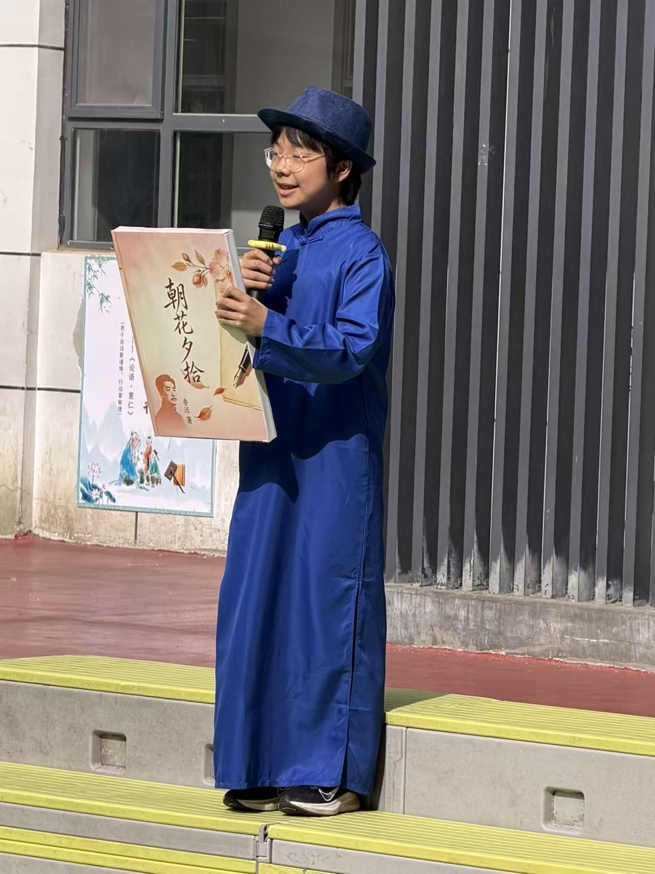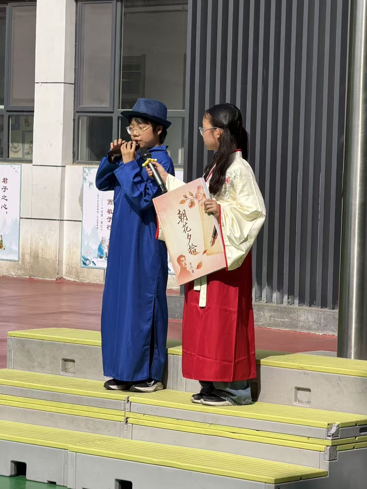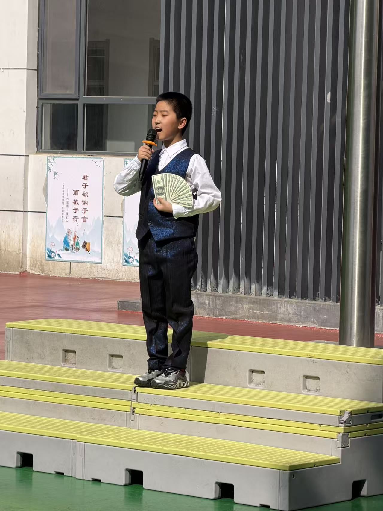 经典诵读环节铿锵有力,五、六年级全体学生依次列队诵读经典名句。五年级学子齐诵“盛年不重来,一日难再晨。及时当勉励,岁月不待人”,彰显少年惜时勤学之志;六年级学生共读“博学之,审问之,慎思之,明辨之,笃行之”,立下博学笃行的成长誓言,朗朗童声回荡校园,尽显中华经典文化魅力。
