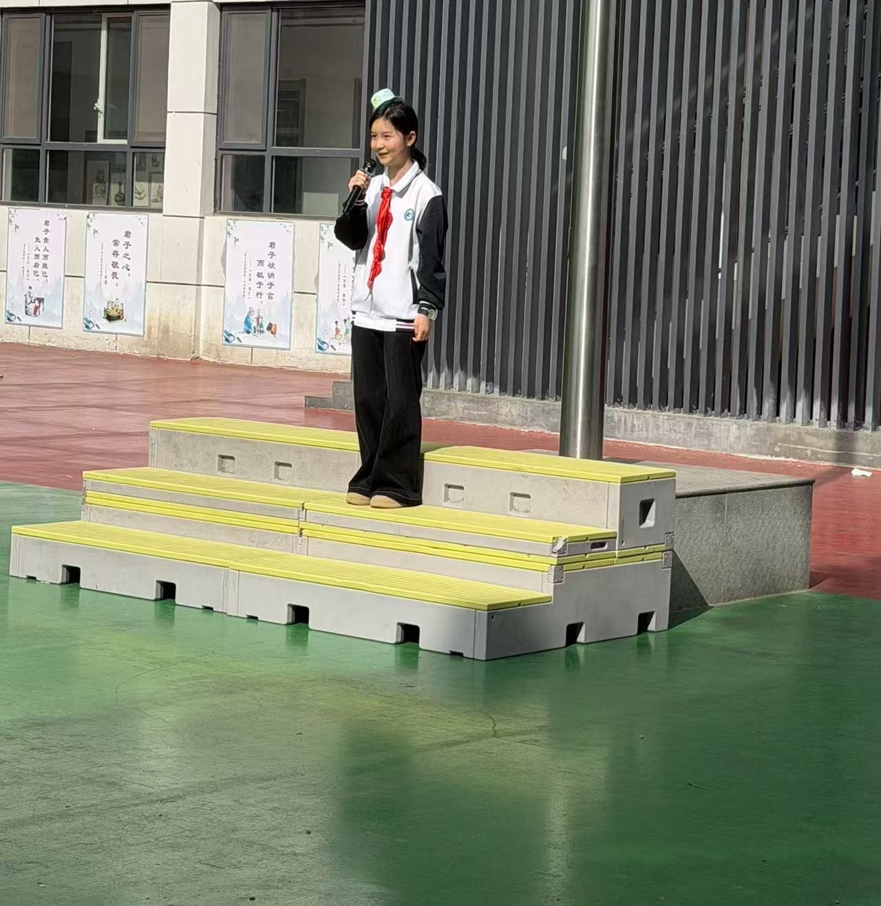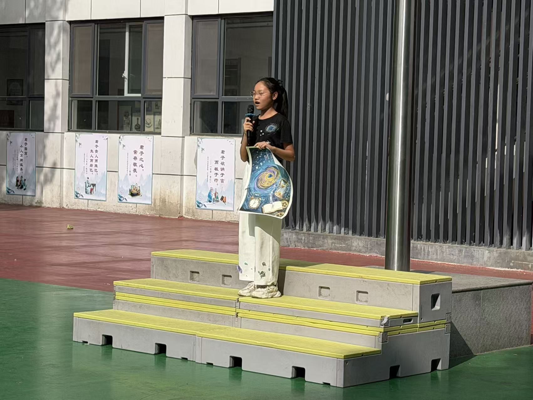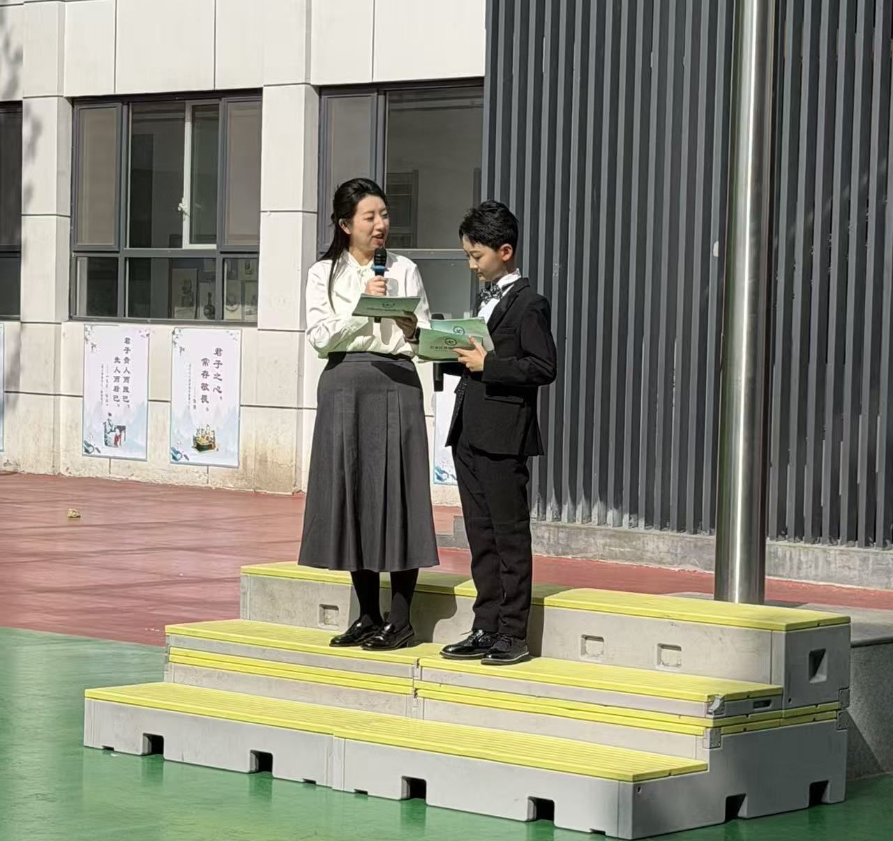 经典诵读环节铿锵有力,五、六年级全体学生依次列队诵读经典名句。五年级学子齐诵“盛年不重来,一日难再晨。及时当勉励,岁月不待人”,彰显少年惜时勤学之志;六年级学生共读“博学之,审问之,慎思之,明辨之,笃行之”,立下博学笃行的成长誓言,朗朗童声回荡校园,尽显中华经典文化魅力。