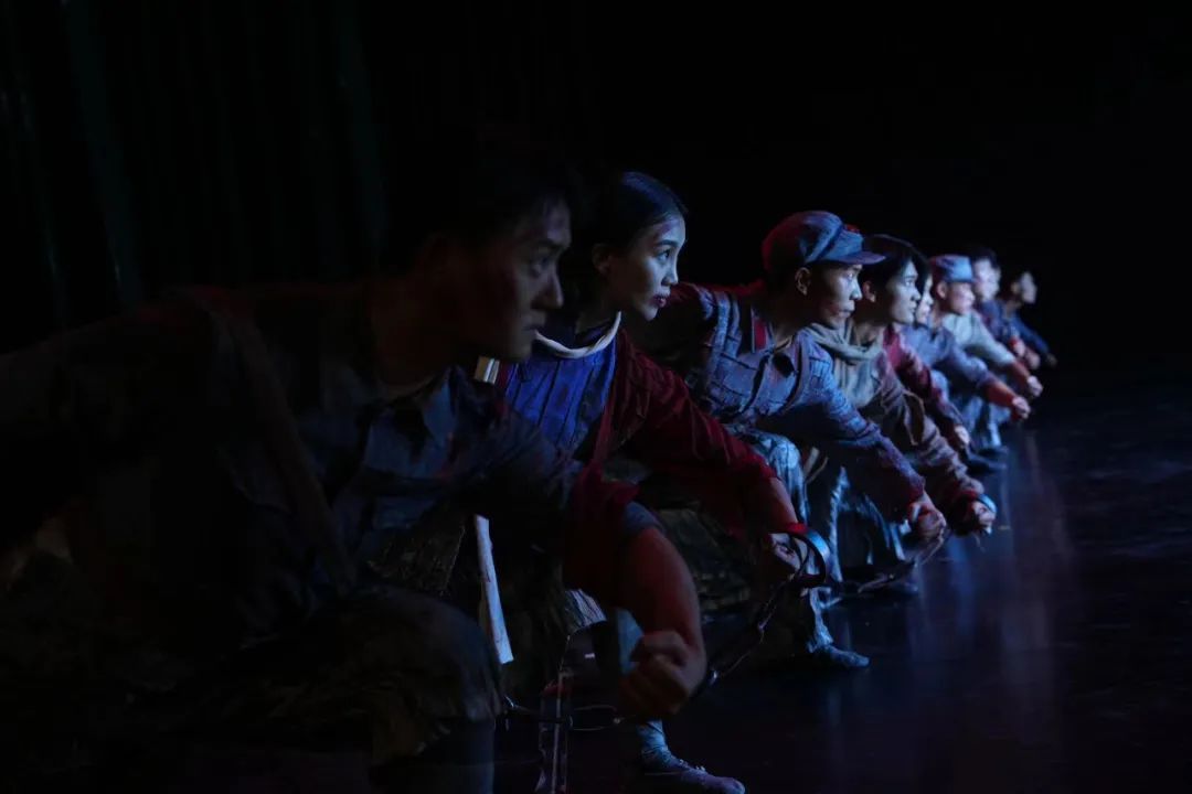 音乐是该部作品最成功的地方,乐思挺拔而畅达,乐意明晰而多维,整体风格瑰丽、宽广、丰富、感人,具有荡涤人心的感觉。从作品情感的浓烈与深挚程度,不难感受到创作者的投情之深、悲恸之真,不难感受到创作者强烈的情感表达冲动。这种生发于生命内部的情感表达冲动之于这部舞蹈,令人不由不感叹整个作品的成功,主创的编舞能力和音乐编配能力,两样都不可或缺。《人民英雄纪念碑》出色的音乐主要体现在巧妙的音乐构思、真切的情境情思摹写、以及民间曲调的贴切运用上。比如,《序》部分运用小型乐队编制就非常巧妙,不仅有“引子”的意义,还有利于清晰交代作品的三个表现对象:一声声低沉的凿石声与随后响起的鼓声喻示战争时代中的战士们“出场”;人声吟唱喻示后人对战争的忧愤与思考;最后加入的小军鼓则喻示着战争的“开始”。接下来的三个部分分别表现战争及其在“人”的心灵与情感上的爆炸性反应,战士们的亲情与友情及其给人的温馨忆念与美好怀想,以及战士们英勇无畏的精神,并用穿越时空的“破圈”手段,实现了英雄与雕刻者的共舞,以及后辈对他们的绵延追思。音乐效果上,三个乐段形成了快与慢、强与弱、刚与柔、沉重与轻灵的审美对比,在相对独立的三个乐段之间,创作者以提琴的固定音型建立起它们的关联性,声音通透,音量不大。柔如彩虹、行云流水般的音响效果仿佛喻示着战士们永生的灵魂,从音乐的精神内部连接起各个乐章,可谓妙在其中。创作者在每个乐段中都巧妙、自然地化用了保定地区的民间小调,并将其与“国际歌”多次结合,使音乐主题立意的表达有了民族音乐的魂与味,让人听来亲切而又新鲜。