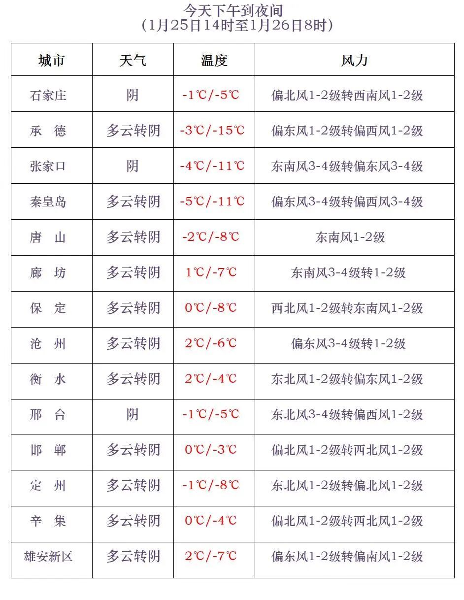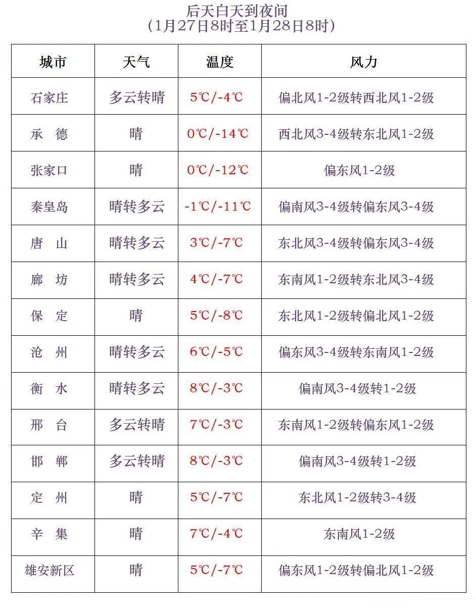 今天下午到夜间,全省阴转多云,其中石家庄、沧州以北地区和邢台西部、邯郸西部有小雪或零星小雪。