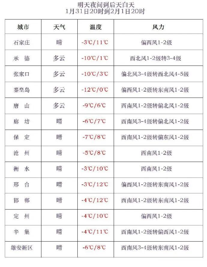 今天傍晚到夜间,全省多云转晴。明天早晨,邢台东部、邯郸东部有雾。最低气温,张家口北部、承德北部-24~-16℃,其他地区-15~-3℃。