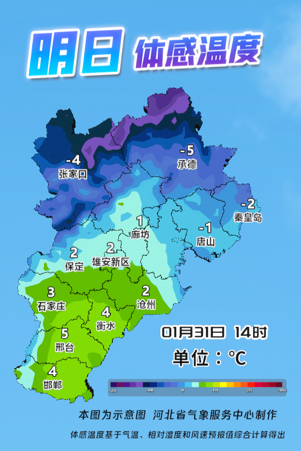 明天夜间到2月1日,保定、廊坊以北地区多云间晴,其他地区晴间多云。