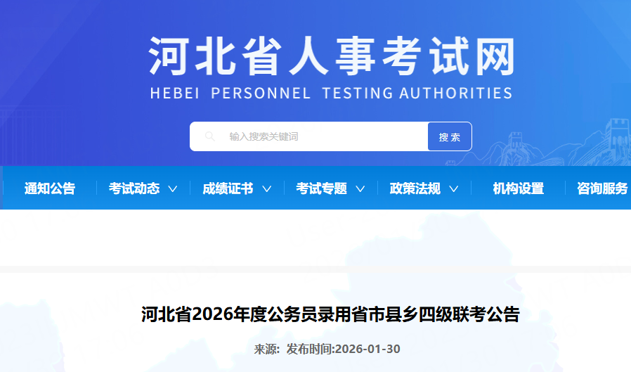 1月30日,河北省人事考试网发布河北省2026年度公务员录用省市县乡四级联考公告,公开招录8650名公务员。具体公告如下↓↓