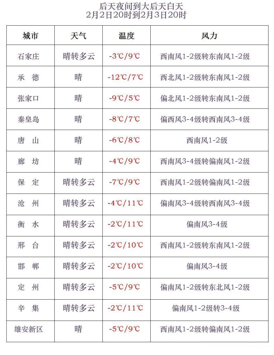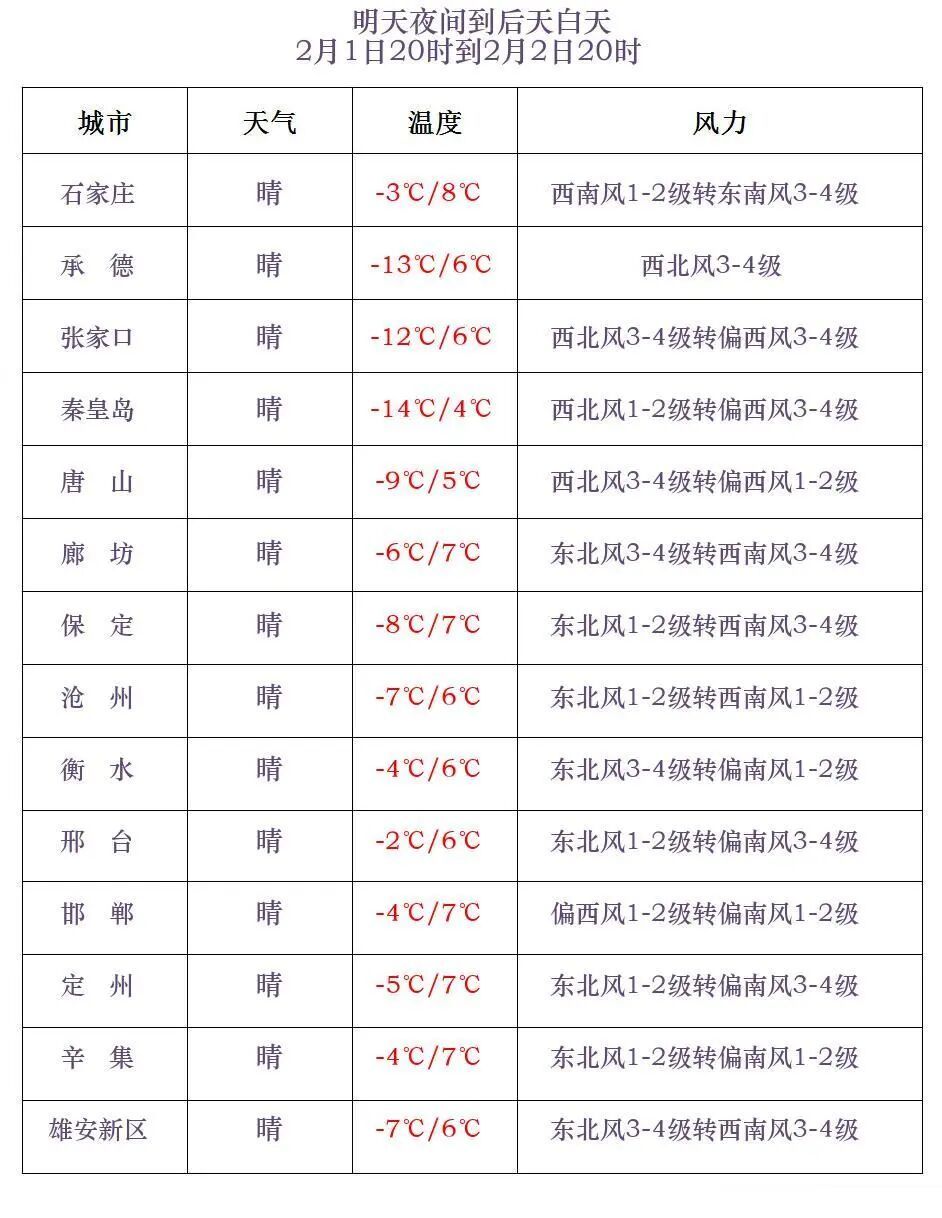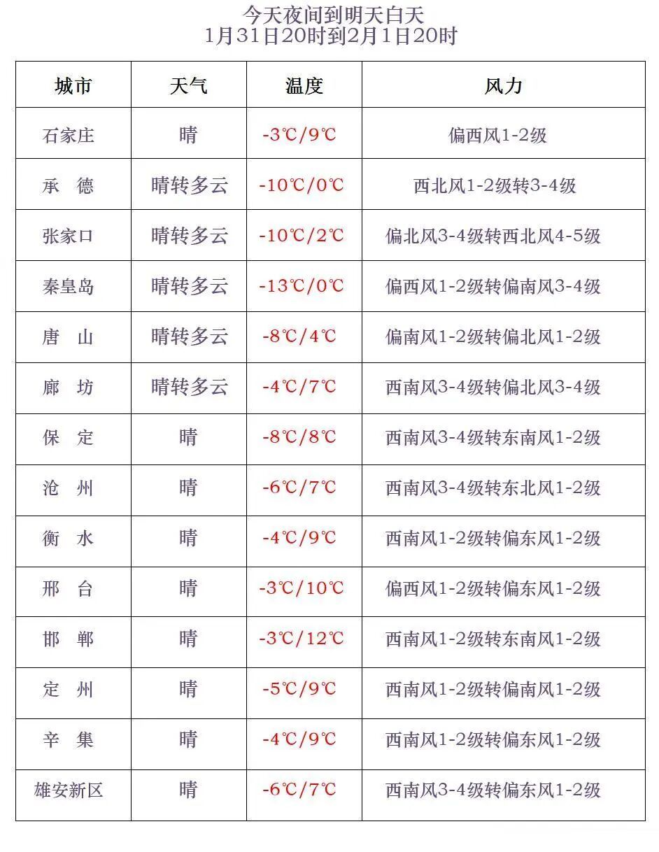 今天傍晚到夜间,张家口北部、承德北部晴转多云,其他地区晴间多云。今天半夜前后到明天上午,保定东部、雄安新区、廊坊南部、石家庄东部、沧州、衡水、邢台东部、邯郸东部有雾。最低气温,张家口、承德、秦皇岛北部-24~-11℃,其他地区-10~-3℃。