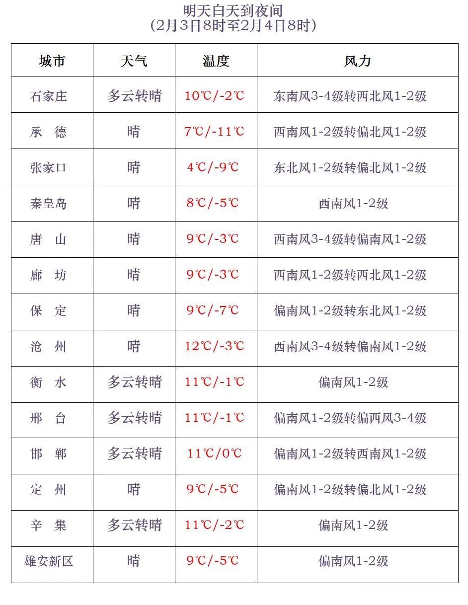 明天白天,石家庄、沧州以南地区晴转多云,其他地区晴间多云。