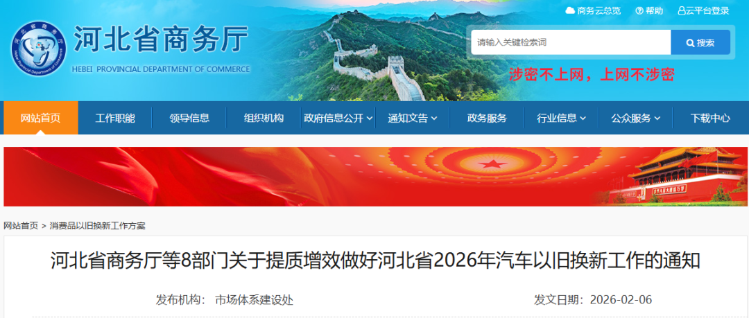 2月6日,河北省商务厅官网发布《河北省商务厅等6部门关于做好2026年家电以旧换新、数码和智能产品购新补贴工作的通知》《河北省商务厅等8部门关于提质增效做好河北省2026年汽车以旧换新工作的通知》。