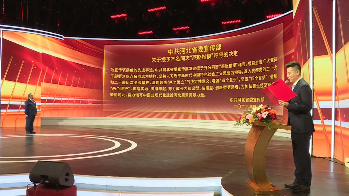 河北广播电视台主持人 冯亮:中共河北省委宣传部决定,授予齐名同志“燕赵楷模”称号。