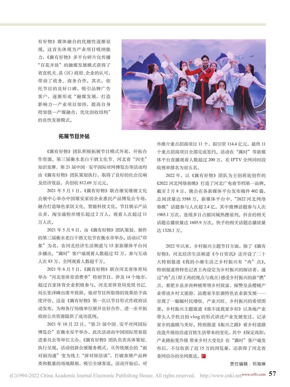 2022 年,以《冀有好物》团队为主创班底创作的《2022 河北网络春晚》打造了河北广电春节档第一品牌。截至 2 月 8 日,晚会在各新媒体平台发布稿件 402 篇,总阅读量达 5588 万。新媒体平台中,“2022 河北网络春晚”话题参与人次超 2.4 亿,其中微博话题参与人次1905.1 万次,连续多日占据同城热搜前列。抖音的相关话题总播放量达 1605.9 万次。快手的相关话题总播放量达 1328.1 万。