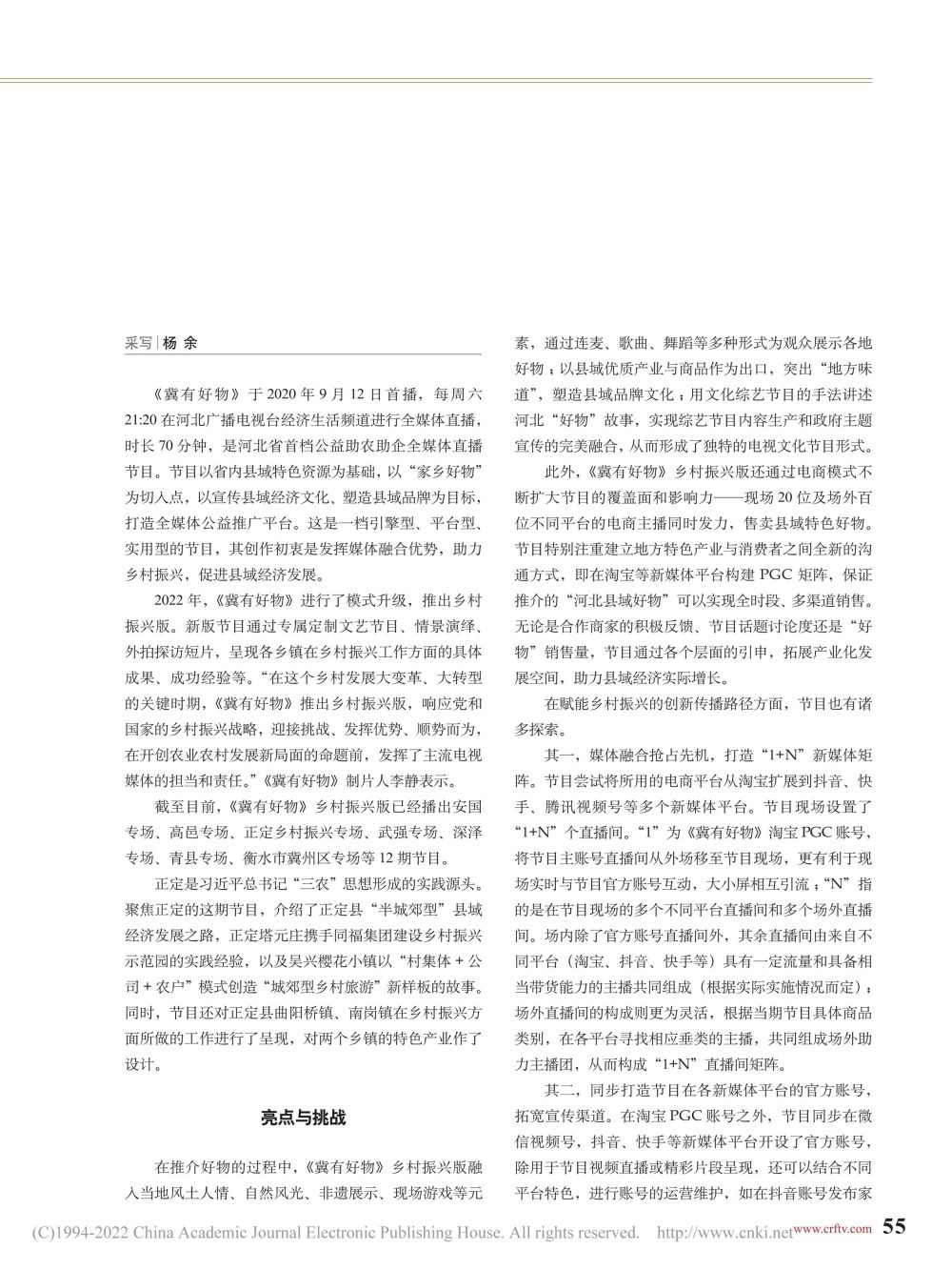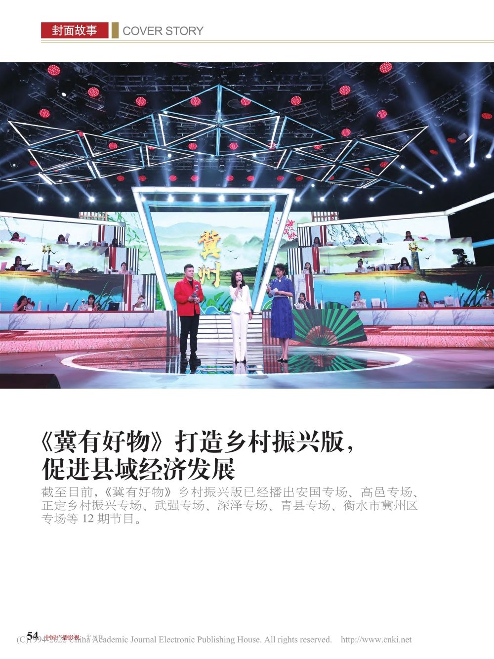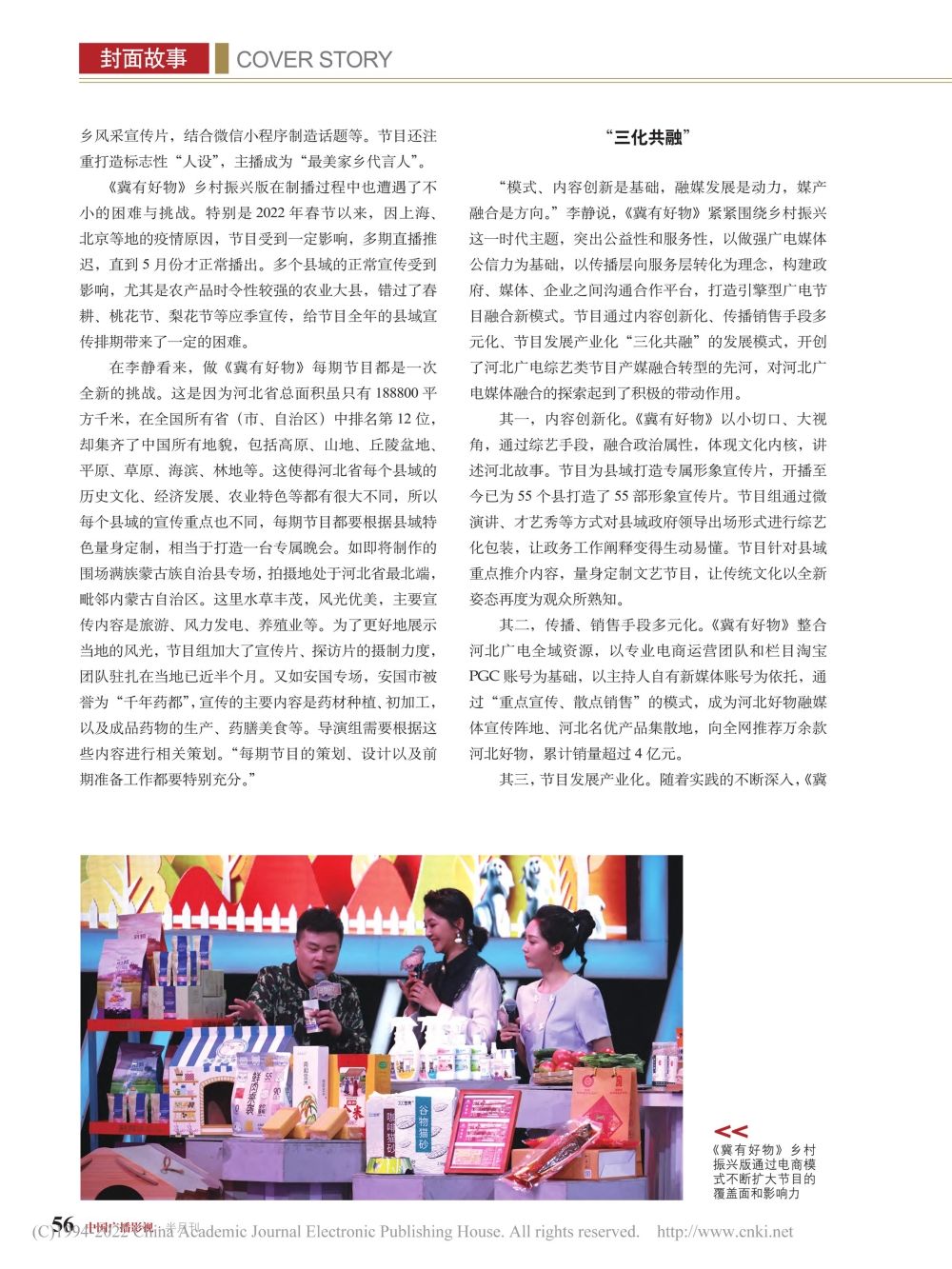 河北广播电视台经济生活频道围绕乡村振兴主题做好主流媒体宣传,既要正能量又有大流量。在刚刚出版的2022年16期《中国广播影视》杂志封面主题:谱写乡村振兴美丽篇章中,经济生活频道《冀有好物》乡村振兴版、《今日资讯》乡村振兴系列报道与湖南卫视《这十年·追光者》、东方卫视《极限挑战8》、广东珠江频道《乡村振兴大擂台》、江西都市频道《美好生活直播间》等一批乡村振兴主题知名节目一同作为广电乡村振兴典型宣传案例向全国推广。专访文章从内容创新化、传播多元化、节目产业化、媒体融合化等角度深入阐述了相关节目的亮点与优势。