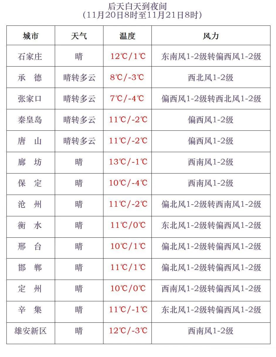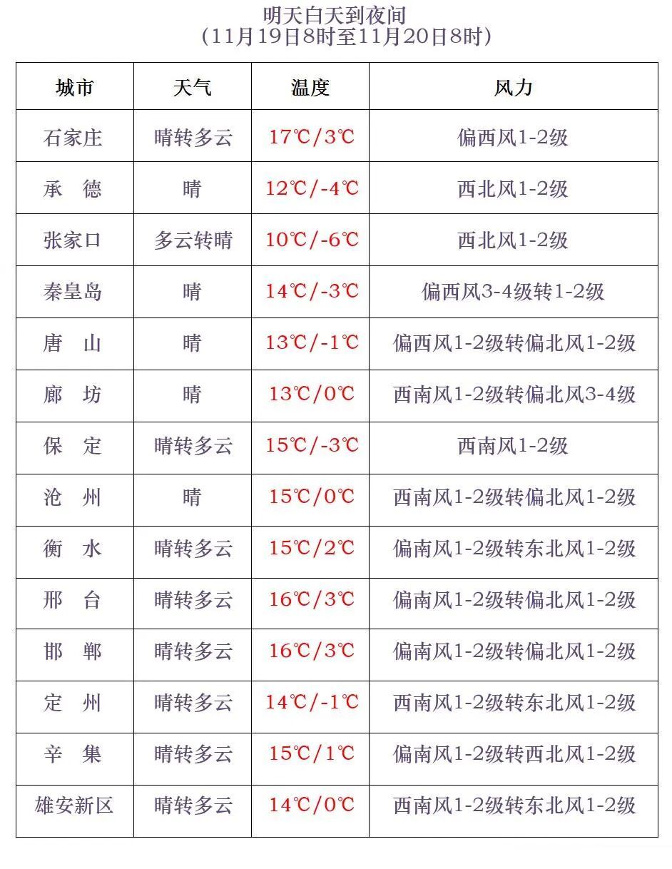 明天夜间到20日,保定、雄安新区、石家庄、衡水、邢台、邯郸多云转晴,其他地区晴间多云。