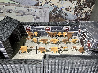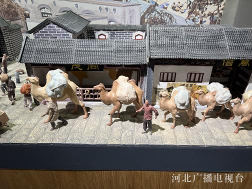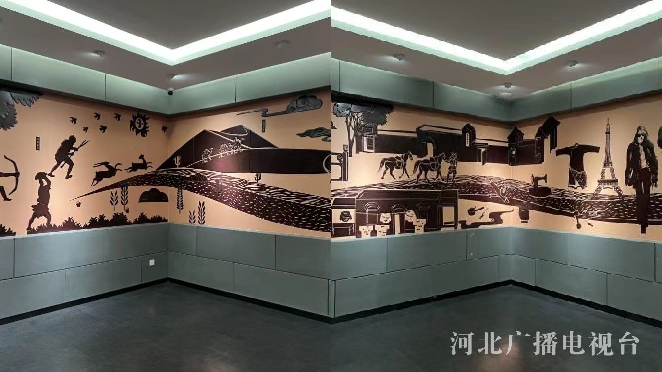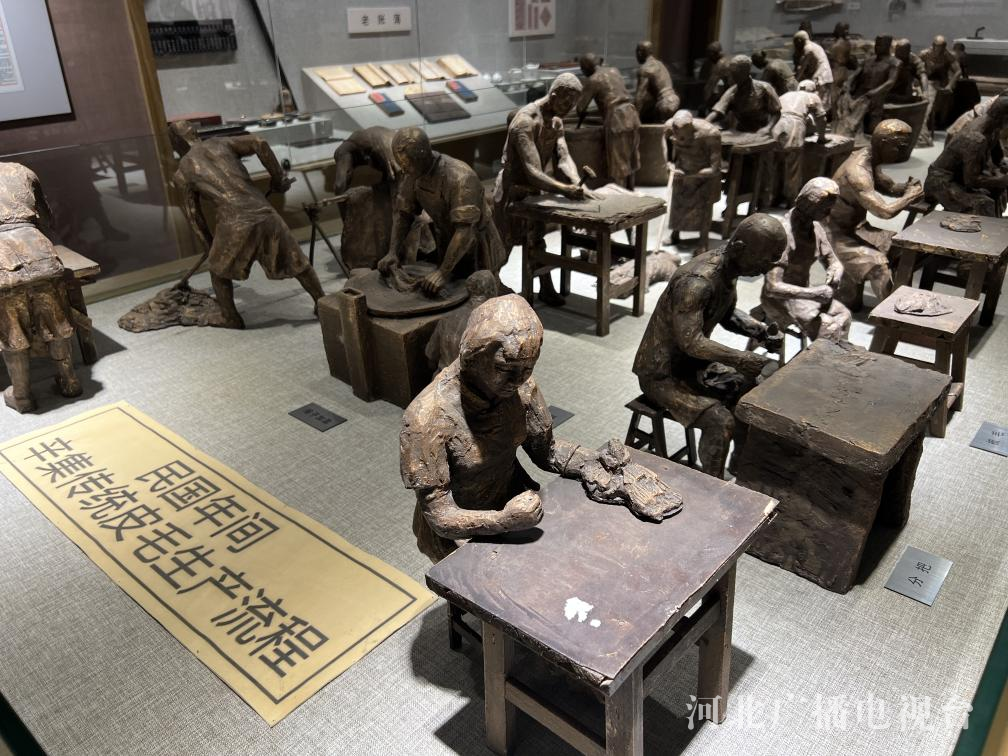 博物馆中,用辛集的非物质文化遗产皮贴画设计了“辛集皮毛文化发展史”,描述了从“人类狩猎制衣”到“比干制革”,由“皮毛古道(一带一路)”到“河北一集,商贾廉官店”,再到现在的“辛集皮革产业”的发展历程。