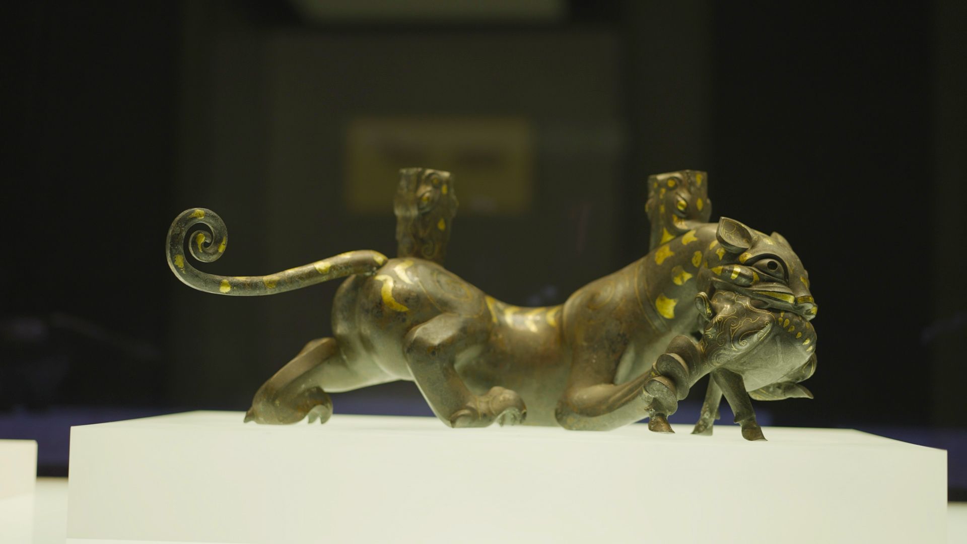 这是中山王厝陵墓出土的错银铜双翼神兽,建造于中山王厝在位的十四年,当为镇席之器或陈设品。神兽多处错有银线纹饰。错,是一种特殊工艺,就是将银丝镶嵌于器物表面。
