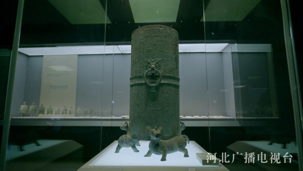 犀足蟠螭纹铜筒形器,器足为三只周身刻卷云纹的犀牛,昂首张目,用力撑起筒身,撑起的是古中山国的威严,彰显着王族气势。