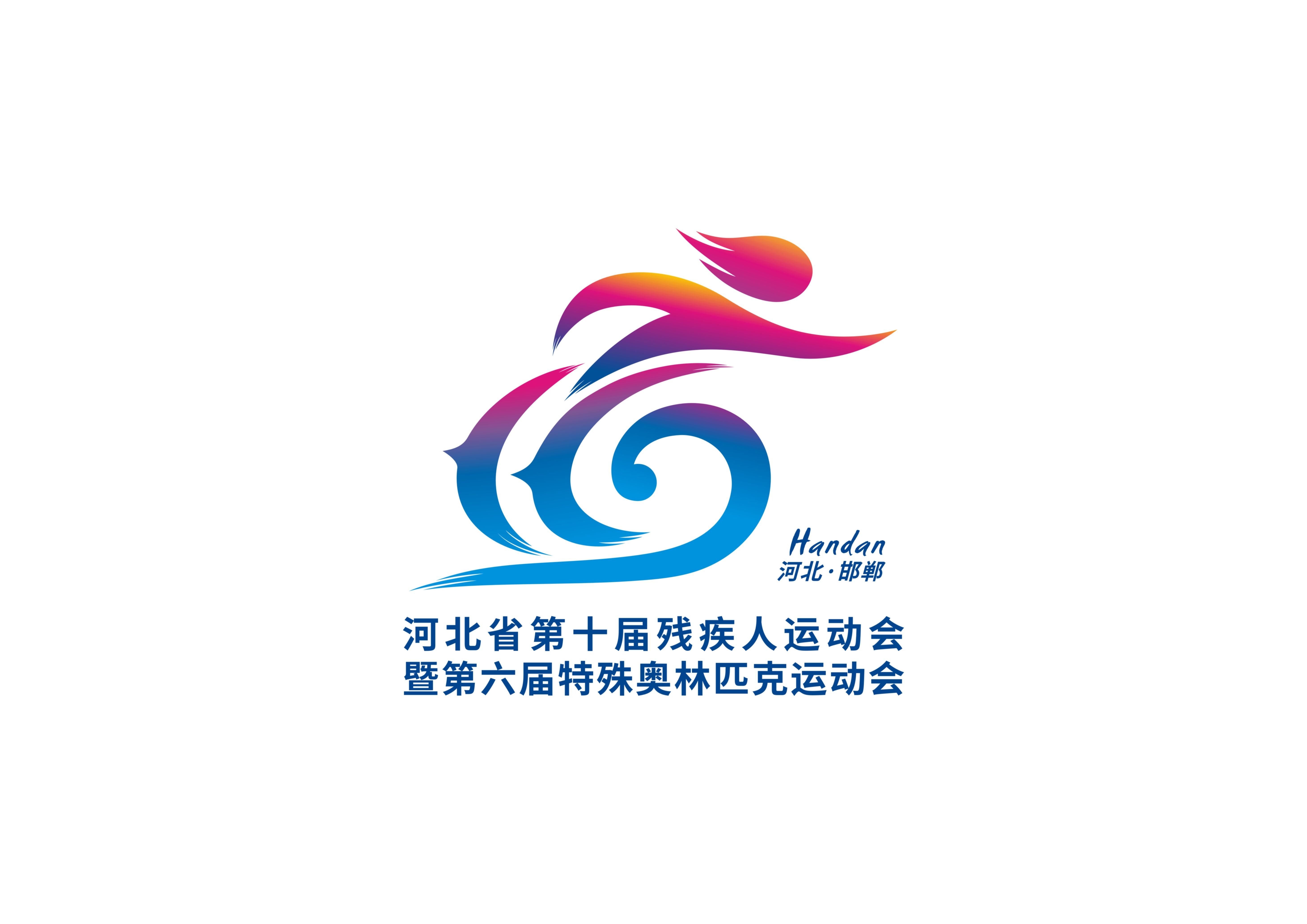 会徽图案以邯郸拼音首字母“H”、“D”为主要元素,巧妙地变形为飞驰的轮椅,承载残疾人运动员奋勇向前,展现了残疾人自强不息、顽强拼搏、热爱生活、超越自我的精神风貌。飞驰的轮椅车轮体现残特奥会“提高残疾人竞技体育和群众体育发展水平”的办赛理念,勇敢的飞鸟在波涛翻涌的水面上展翅翱翔,体现邯郸人民积极进取、开拓创新、激流勇进的精神状态。数字“10”和“6”明确了本届河北省残疾人运动会和特殊奥林匹克运动会举办届次,燃烧的火焰寓意残疾人事业的蓬勃发展。
