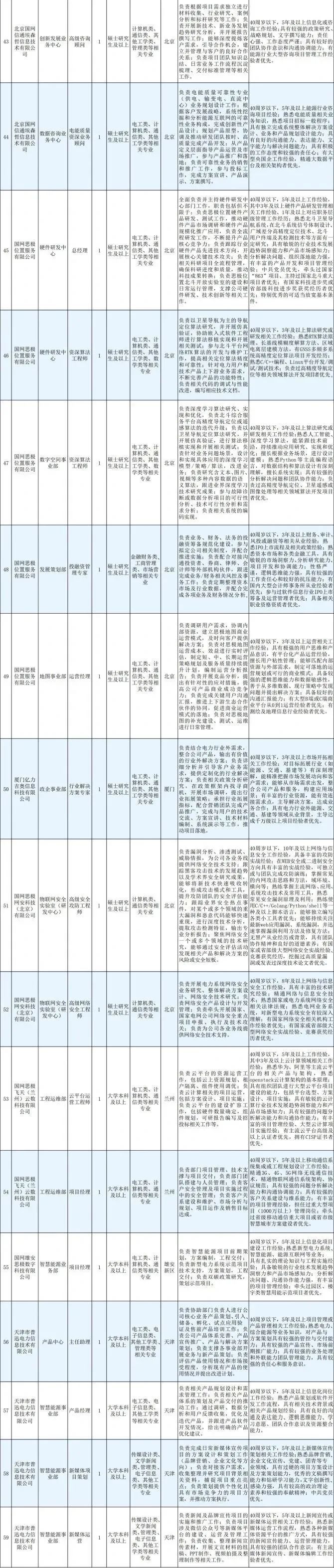 本次国网信通产业集团所属21家单位招聘管理及技术类岗位59个,共计60人,其中中级管理岗位7人。录用人员为市场化聘用,与各招聘单位签订劳动合同。具体招聘岗位及任职资格如下: