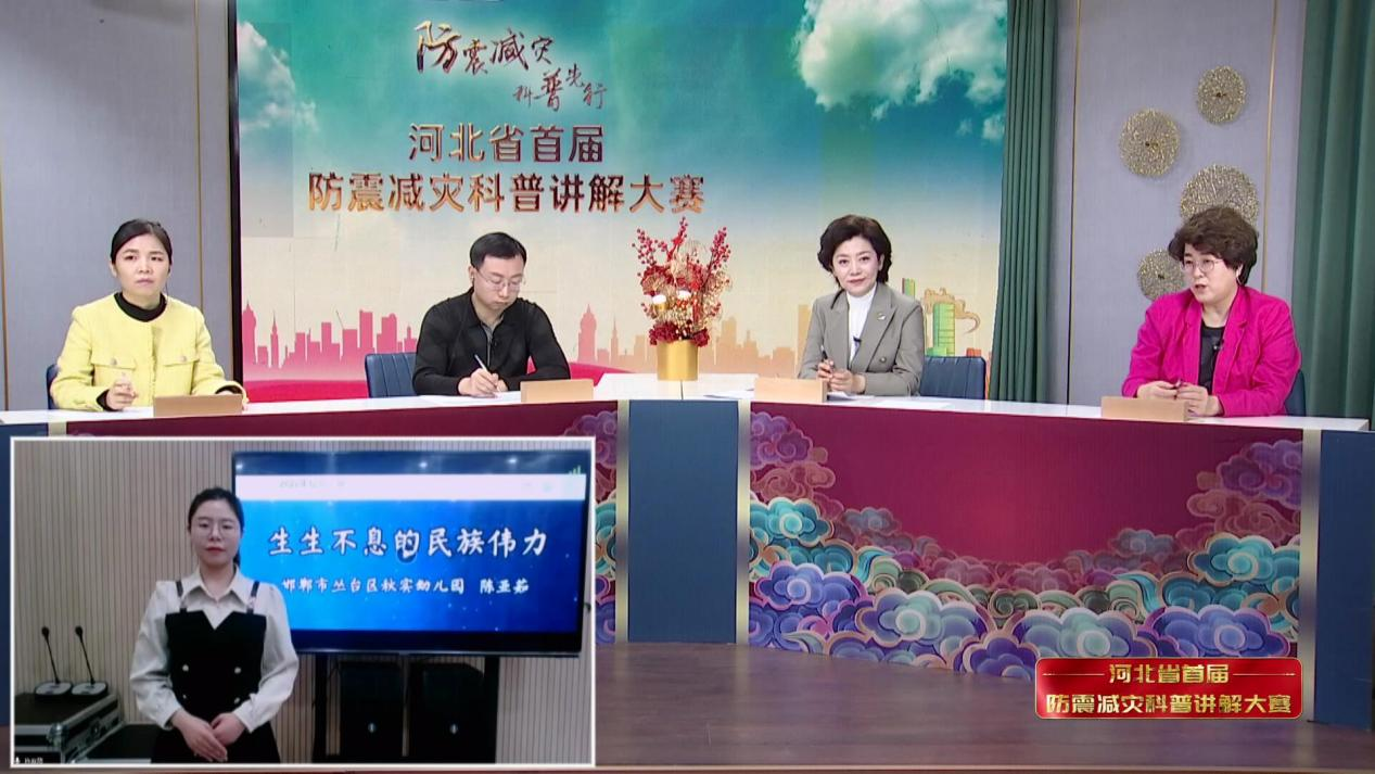 2022年12月29日至30日,河北省首届防震减灾科普讲解大赛半决赛顺利举办,本次大赛是由河北省地震局、河北省应急管理厅、河北省科学技术协会主办,河北广播电视台承办。大赛主题为“防震减灾 科普先行”,大赛的宗旨是为进一步做好河北省防震减灾科普宣传工作,提升公众防震减灾科学素质,提高全社会防震减灾综合能力。河北省地震局信息中心副主任李红梅、河北省地震局河北地震台副台长马栋、河北广播电视台首席主持人王颖、河北广电盛腾文化传媒有限责任公司副总经理晨露出席并担任评委。