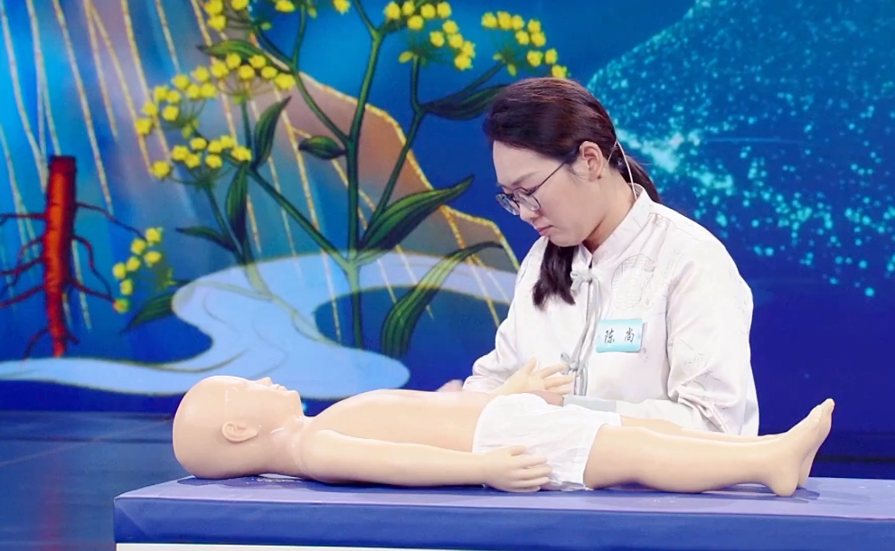 三、小儿推拿。本环节6位选手随机翻转号码牌,每个号码牌背后有1个临床病例,选手需根据随机抽取的病例作出诊断及治疗,并在5分钟内完成操作。评委根据选手的作答及操作表现进行打分,满分30分。