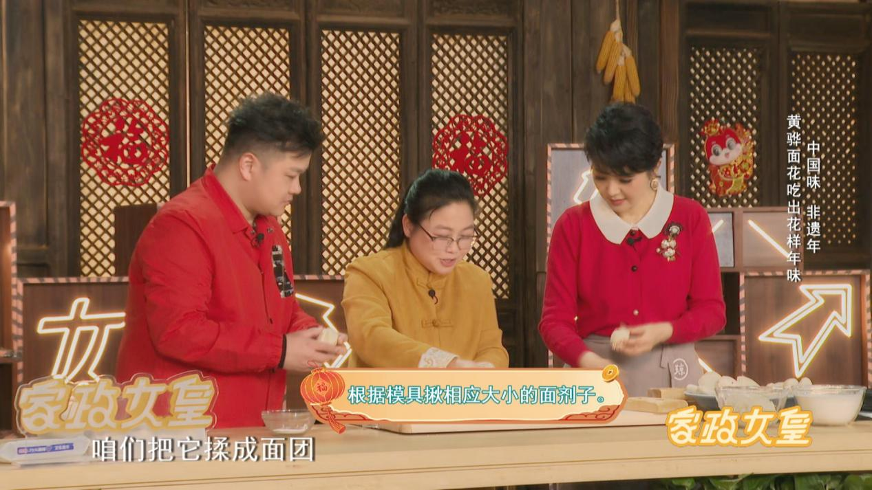 除夕守岁的时候很多家庭的饭桌上还会有面花的身影,河北沧州的黄骅面花制作技艺在2009年被列入了河北省非物质文化遗产名录。所以今天我们也邀请到了黄骅面花手艺人黄丽颖,来到了节目现场,为大家制作黄骅面花。