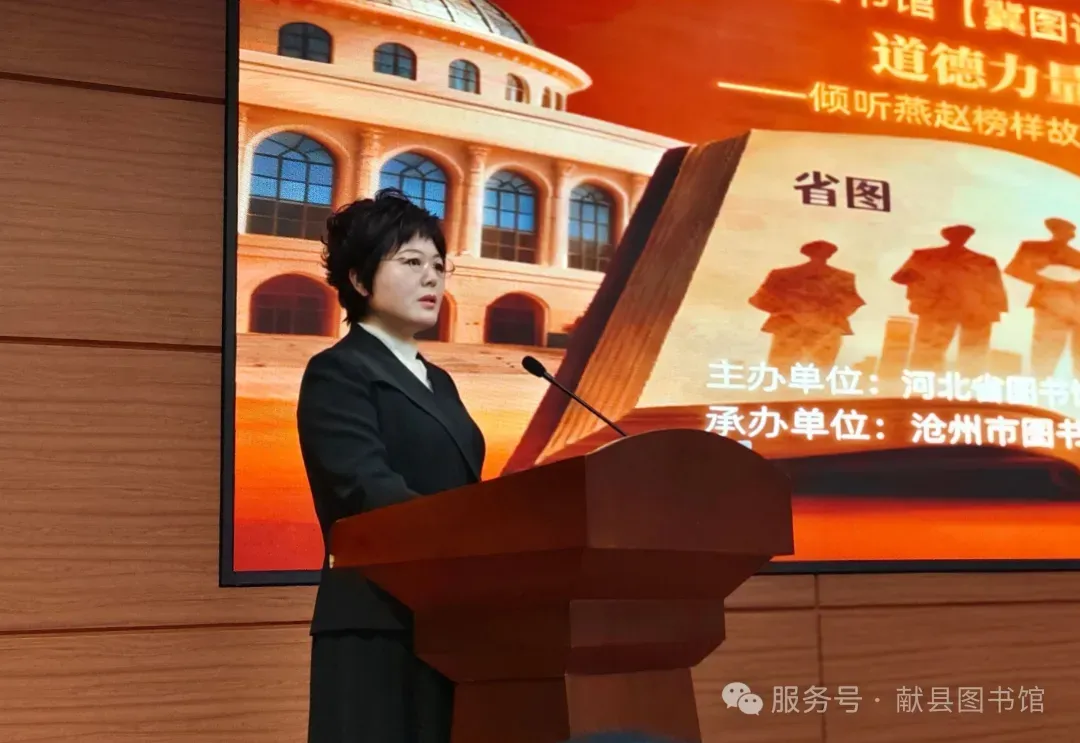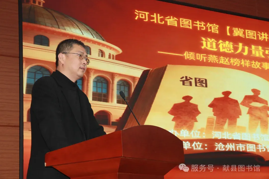 随后,河北省图书馆副馆长冉华致辞。她说,献县历史悠久,人文底蕴深厚,献王刘德修学好古的治学精神、“小毛公”毛苌传承《诗经》的文脉坚守、纪晓岚编纂《四库全书》的文化担当,以及民族英雄马本斋的家国大义,让现场观众深深感受到这片土地的道德底蕴与文化基因。冉华副馆长表示,此次【冀图讲坛】走进献县,既是一次文化资源的交流融合,更是一场精神脉络的溯源与回归,希望以榜样故事为桥,让燕赵道德精神在新时代焕发新活力。