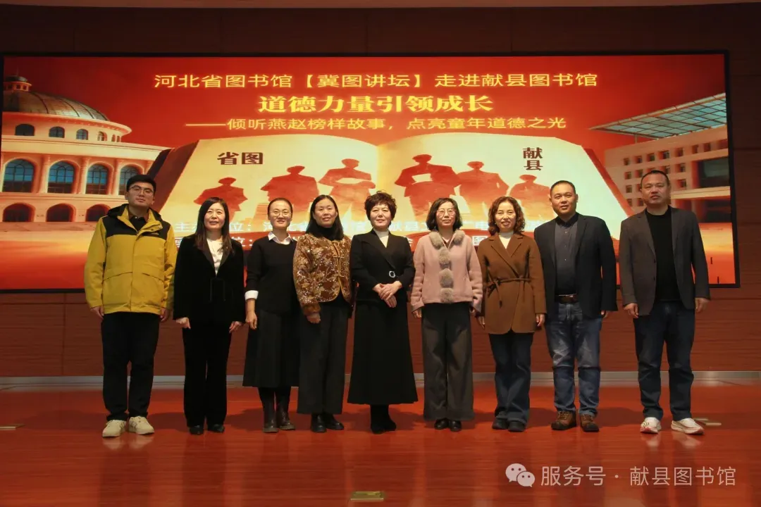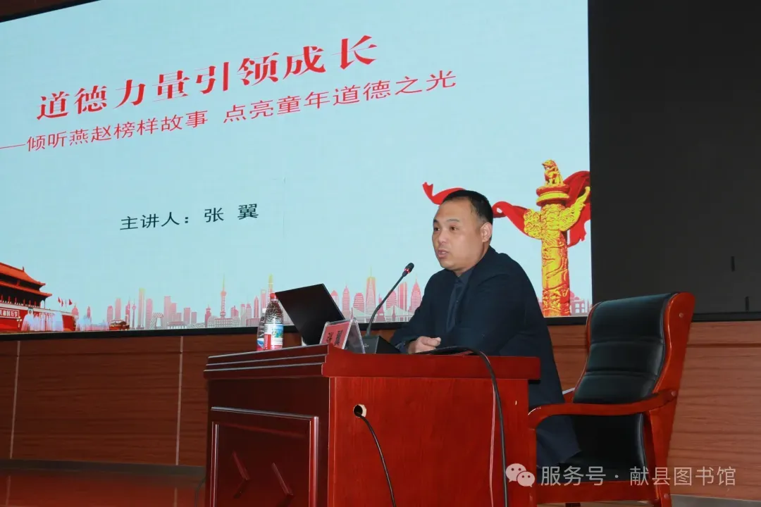 书香传雅韵,德润赤子心。为深入学习贯彻党的二十届四中全会精神,推动优质文化资源下沉基层,扎实推进文化惠民工程与精神文明建设深度融合,2025年11月19日,献县成功举办河北省图书馆【冀图讲坛】走进献县图书馆活动。本次活动由河北省图书馆、献县文化广电和旅游局主办,沧州市图书馆学会、献县图书馆承办,活动以“道德力量引领成长——倾听燕赵榜样故事,点亮童年道德之光”为主题,为现场师生、读者300余人带来了一场兼具思想深度与情感温度的文化盛宴。