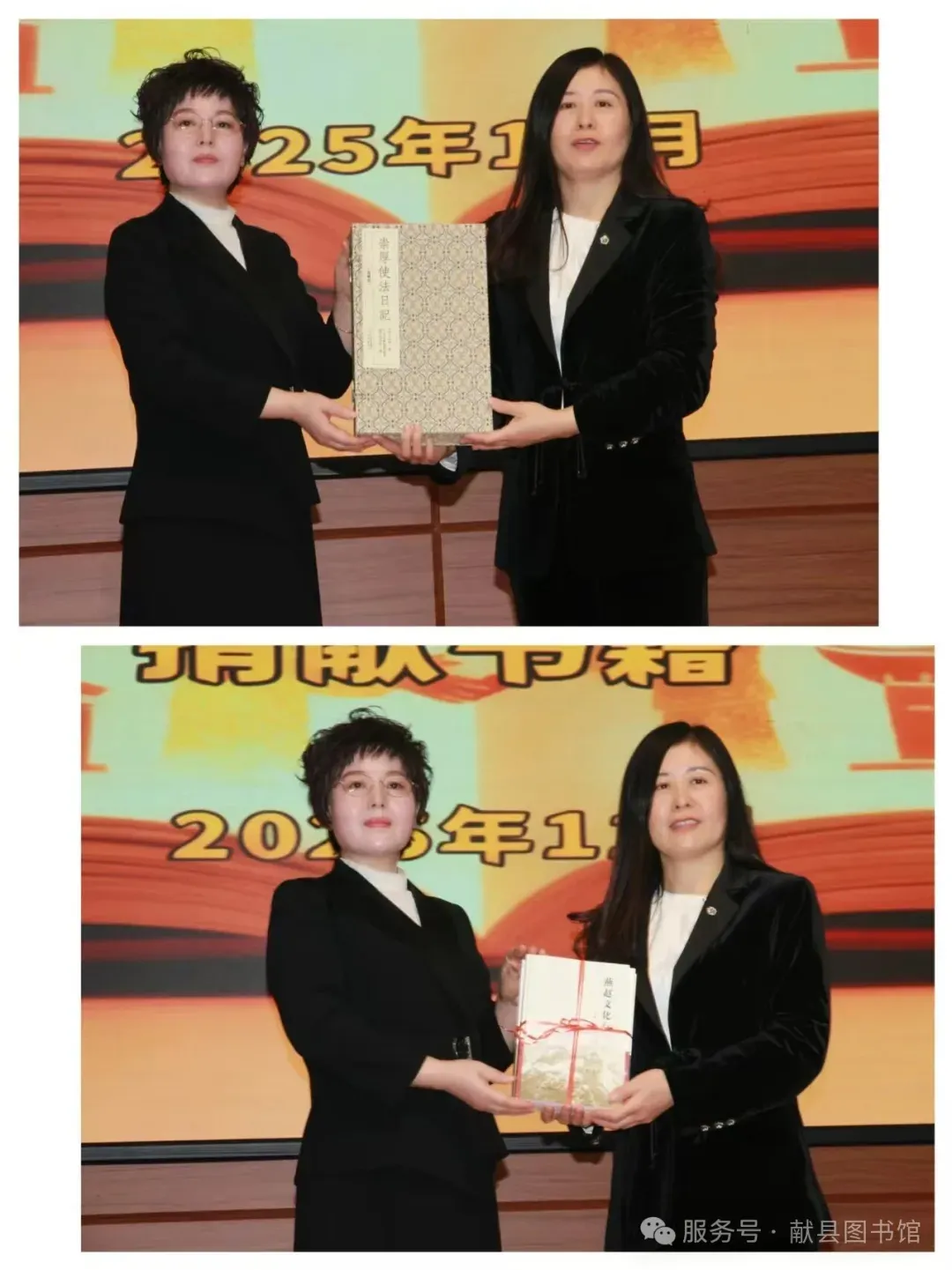 仪式现场还举行了书籍捐赠环节。冉华副馆长代表河北省图书馆,向献县图书馆捐赠《崇厚使法日记》影印本与《冀图讲坛文集》珍贵书籍,为献县图书馆的馆藏注入新的活力,助力知识传播与文化共享。