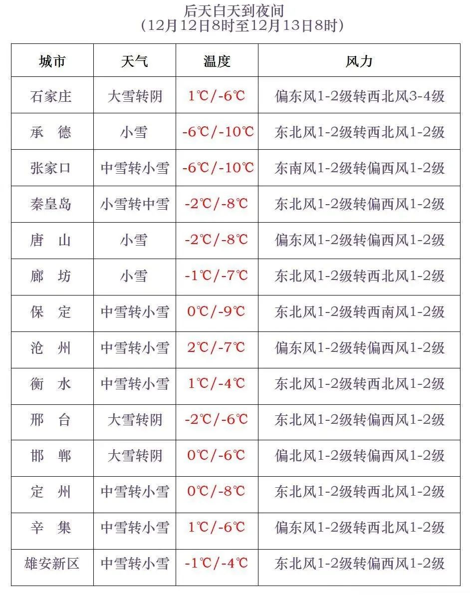 12日夜间到13日,保定西部、石家庄西部、邢台、邯郸多云转晴,其他地区阴有小雪转多云,局地有中雪。