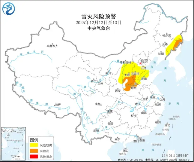 受10-13日寒潮过程带来的大风降温和大范围雨雪天气影响,预计新疆、西北地区、华北、黄淮、内蒙古中部、东北地区中南部等地有小到中雪或雨夹雪,部分地区大雪或暴雪;易导致部分温室棚舍遭受雪压垮塌,棚内蔬菜和牲畜受冻。其中,12-13日山西大部、河北中南部、河南北部和西部部分地区、山东北部、陕西东部、吉林东部、黑龙江东南部和辽宁东北部等地设施农业、畜牧业出现雪灾的风险较高(黄色预警),山西南部、河北西南部、河南北部和西部部分地区、吉林东部雪灾风险高(橙色预警)。