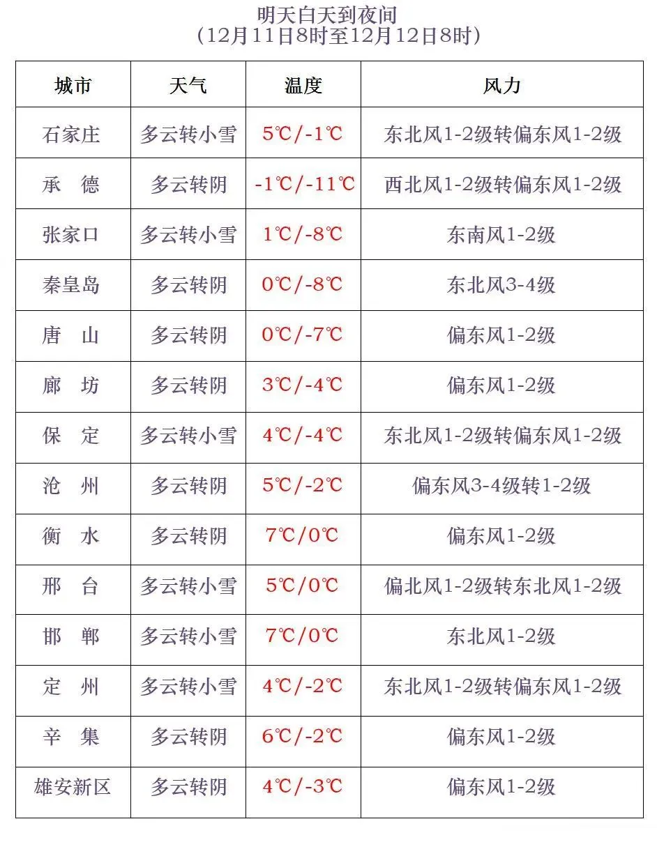 明天夜间到12日,全省阴有小雪到中雪,其中张家口、保定、石家庄、邢台、邯郸等地的部分地区有大雪。