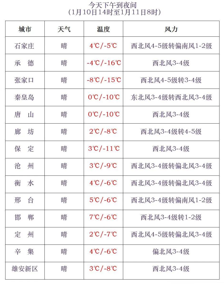 受冷空气影响,10日下午到夜间,张家口、承德北部和保定、石家庄、邢台、邯郸四个地区的西部有西北风5到6级,阵风7到8级,局地9级以上;其他地区有西北风4到5级,阵风6到7级。10日夜间,渤海海域和沿海地区有西北风6到7级,阵风8到9级。请注意防范。