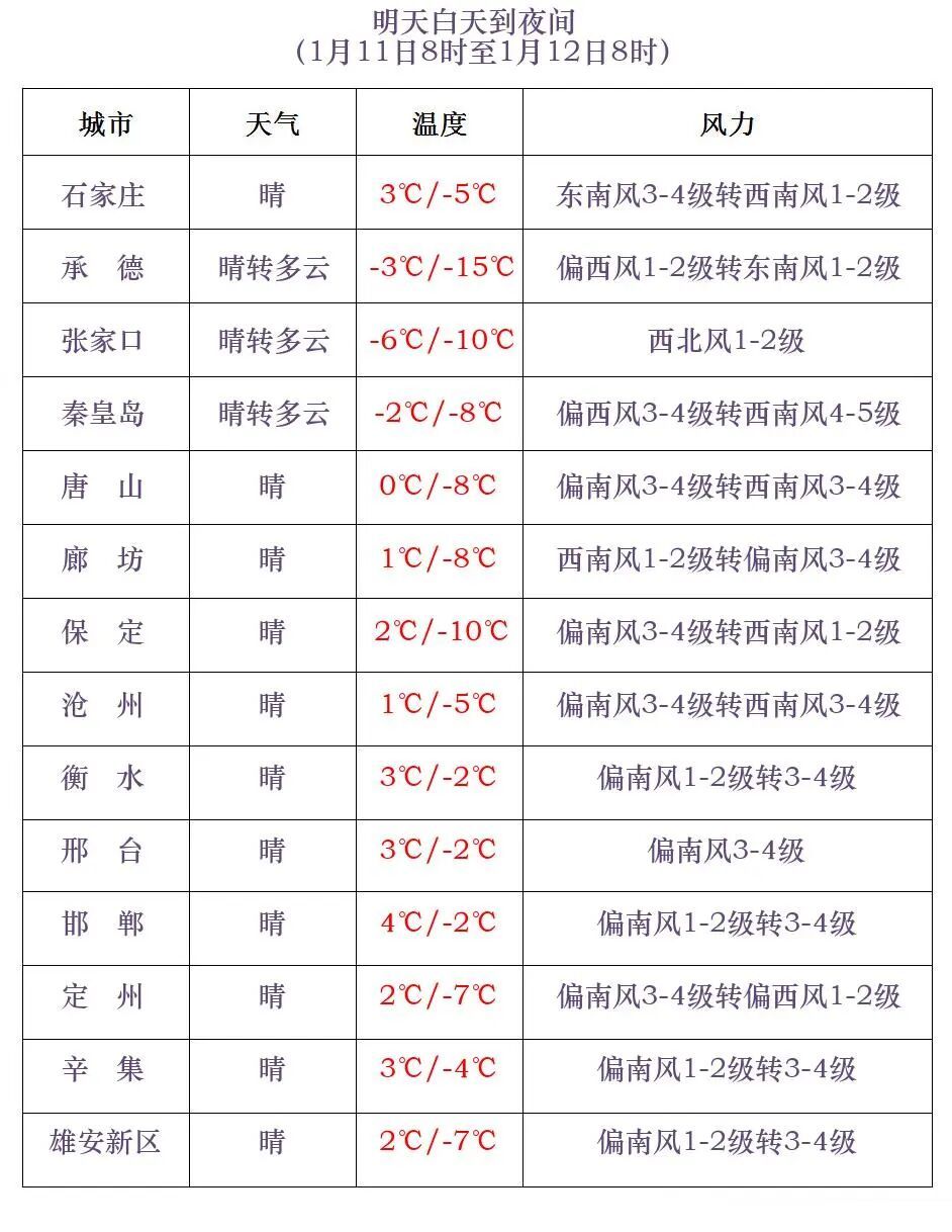 11日夜间到12日白天,张家口、承德和保定、石家庄、邢台、邯郸四个地区的西部有西北风4到6级,阵风7到8级,局地可达9级以上。11日夜间,渤海海域和沿海地区有西南风5到6级,阵风7到8级。