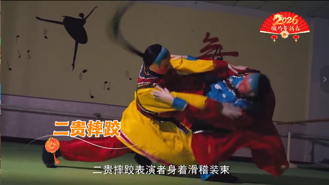 看二贵摔跤单人演绎双人博弈,表演者背负特制木架,身着双色服饰,以抡、转、滚、摔的武术技法,再现满族传统体育竞技的诙谐与震撼。