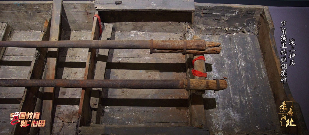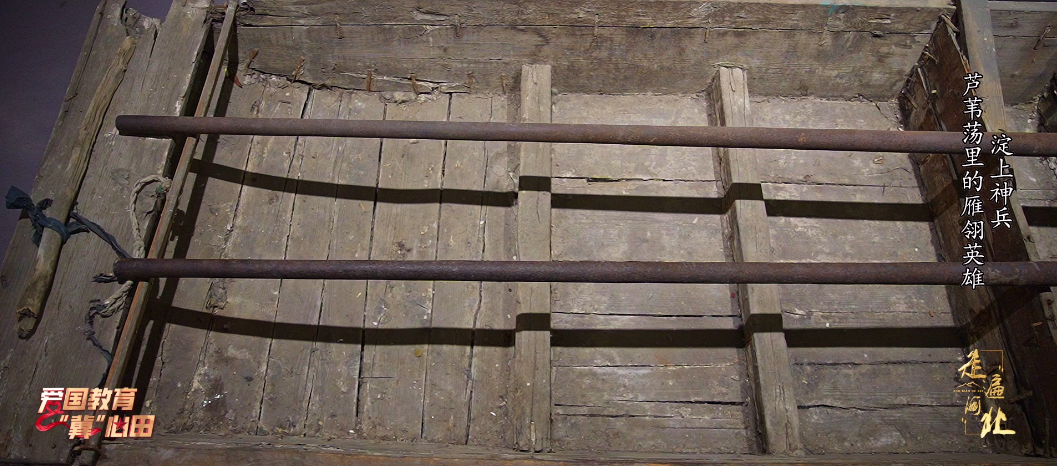 张艳:“答案就是这艘木船,它有一个响亮的名字‘枪排’,为防止枪膛火药受潮,人们习惯在信口处插上一根雁翎,这就是雁翎队名字的由来。”